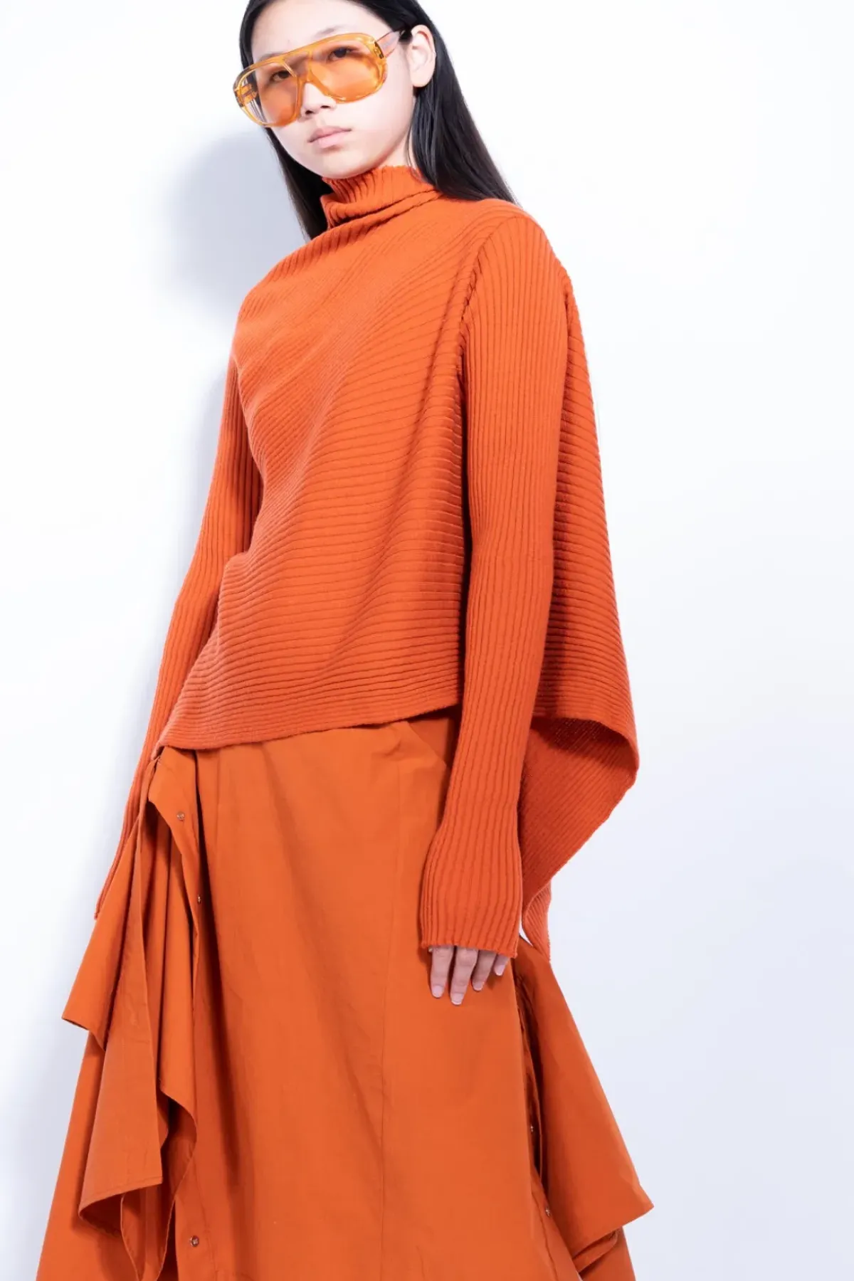 Asymmetric sweater in orange merino knit that reveals a twisted texture and a slashed cowl neck, while the signature M'A raw hemlines and longline sleeves exude sophistication.