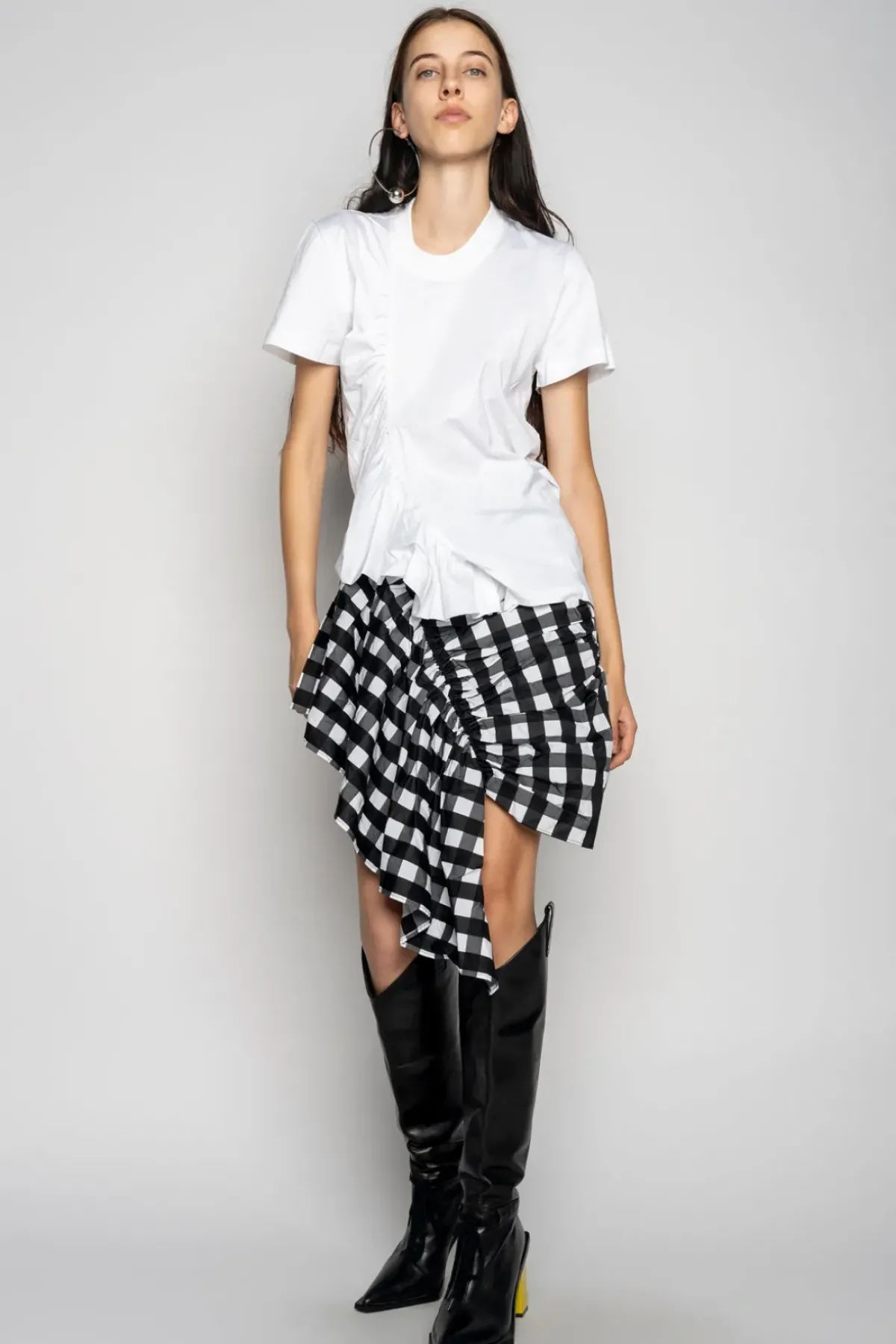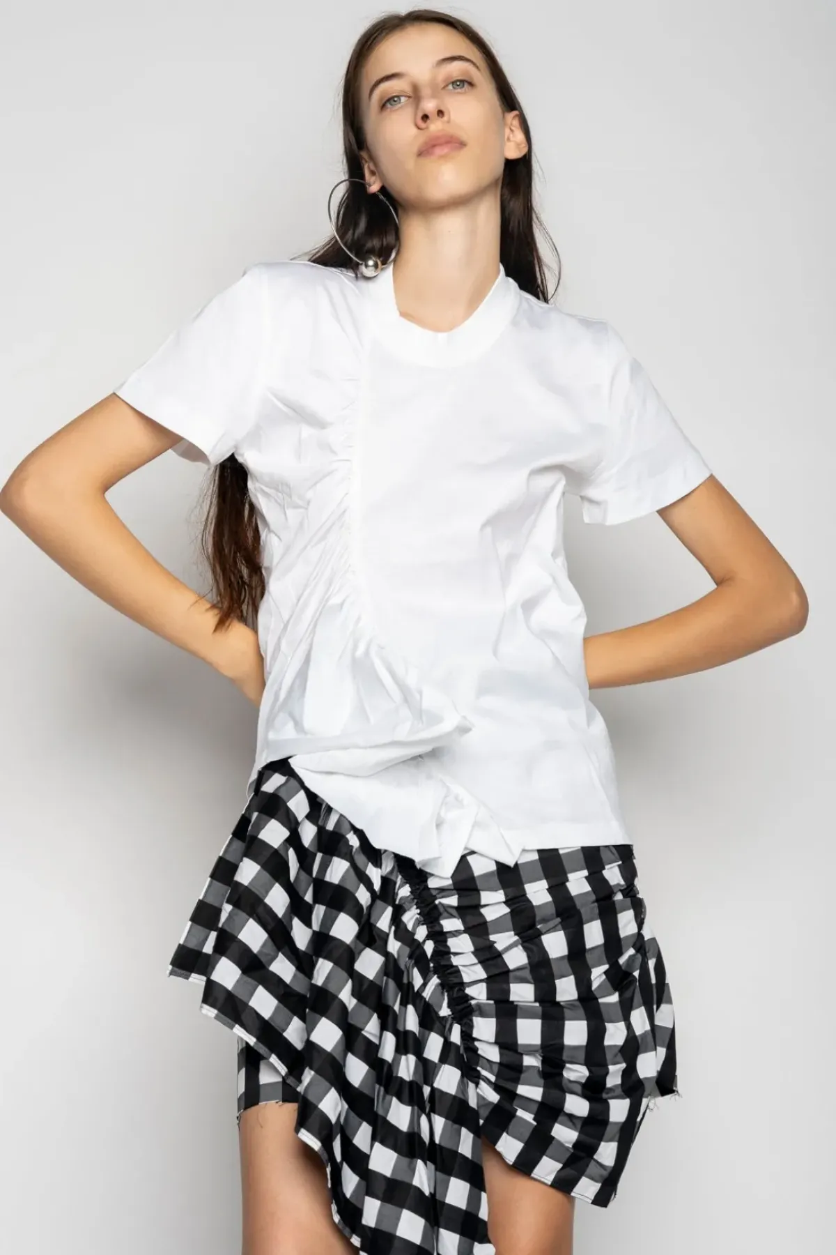 Feel effortlessly stylish in this white asymmetrical t-shirt! Flaunting a round neck, short sleeves, delicate ruffle trim and a high-low hem, you'll look amazing!