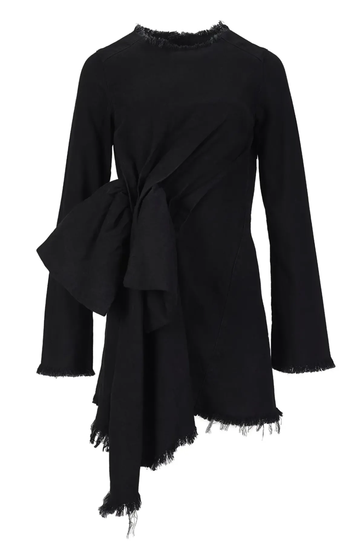 Flaunt your style in this black denim mini dress, featuring a front bow, round neck, rear zip fastening and flattering A-line shape.