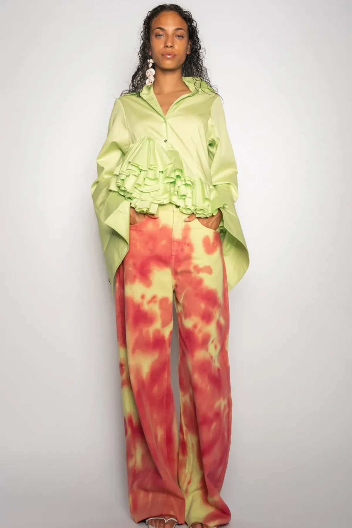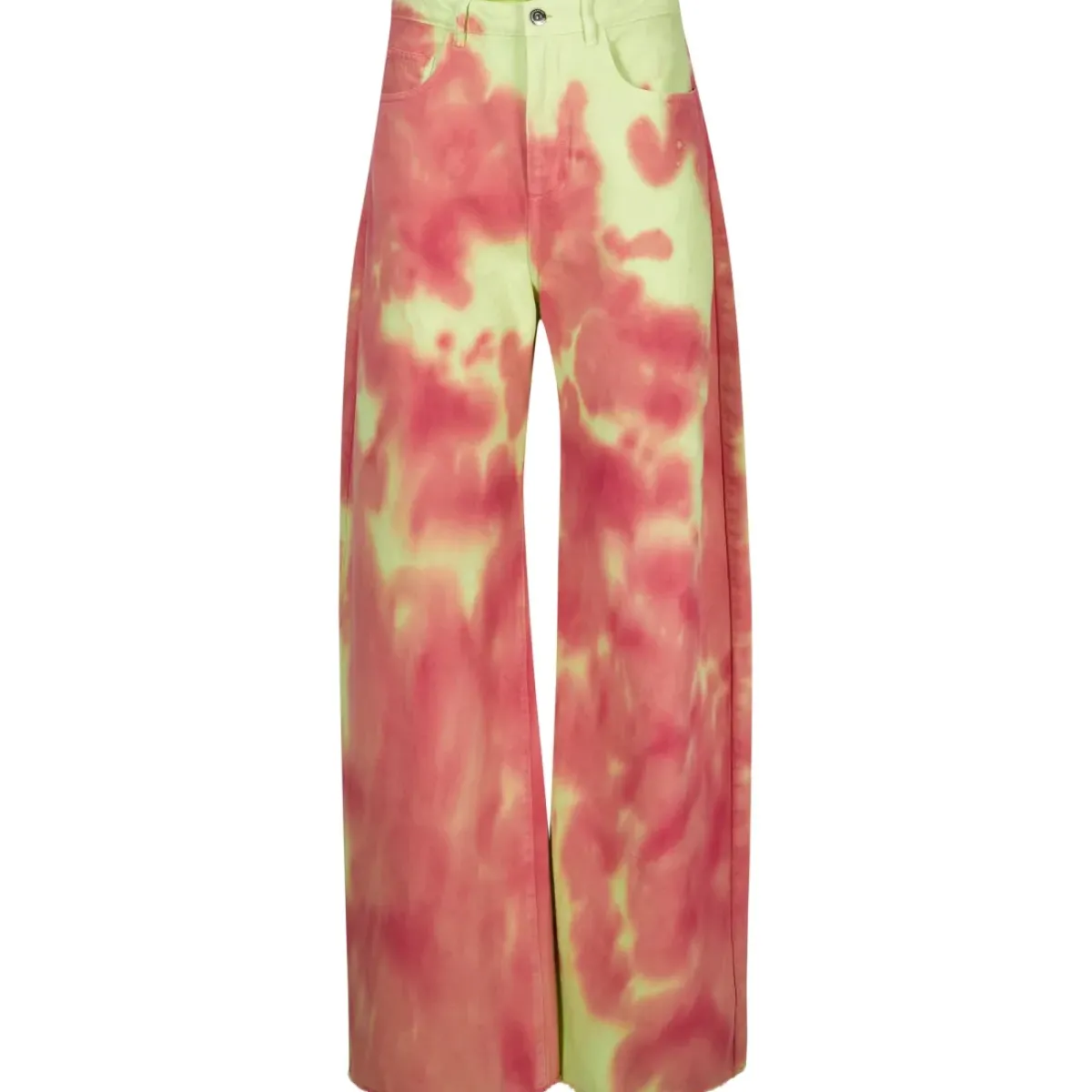 These M'A 5-pocket boyfriend jeans are dyed in red and lime and feature a raw hem and comfortable fit with a high waist. The wide-leg design is perfect for making a fashion statement.