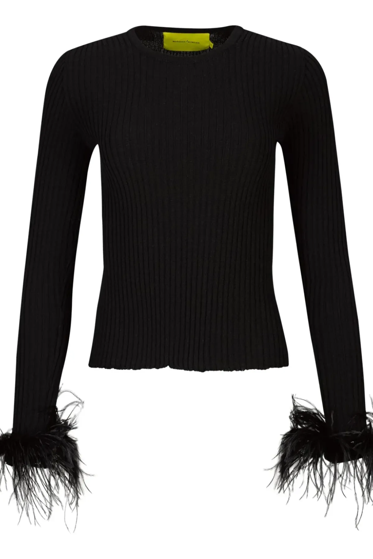 Black merino wool top, featuring intricate feathers along the long sleeves for a unique flair.