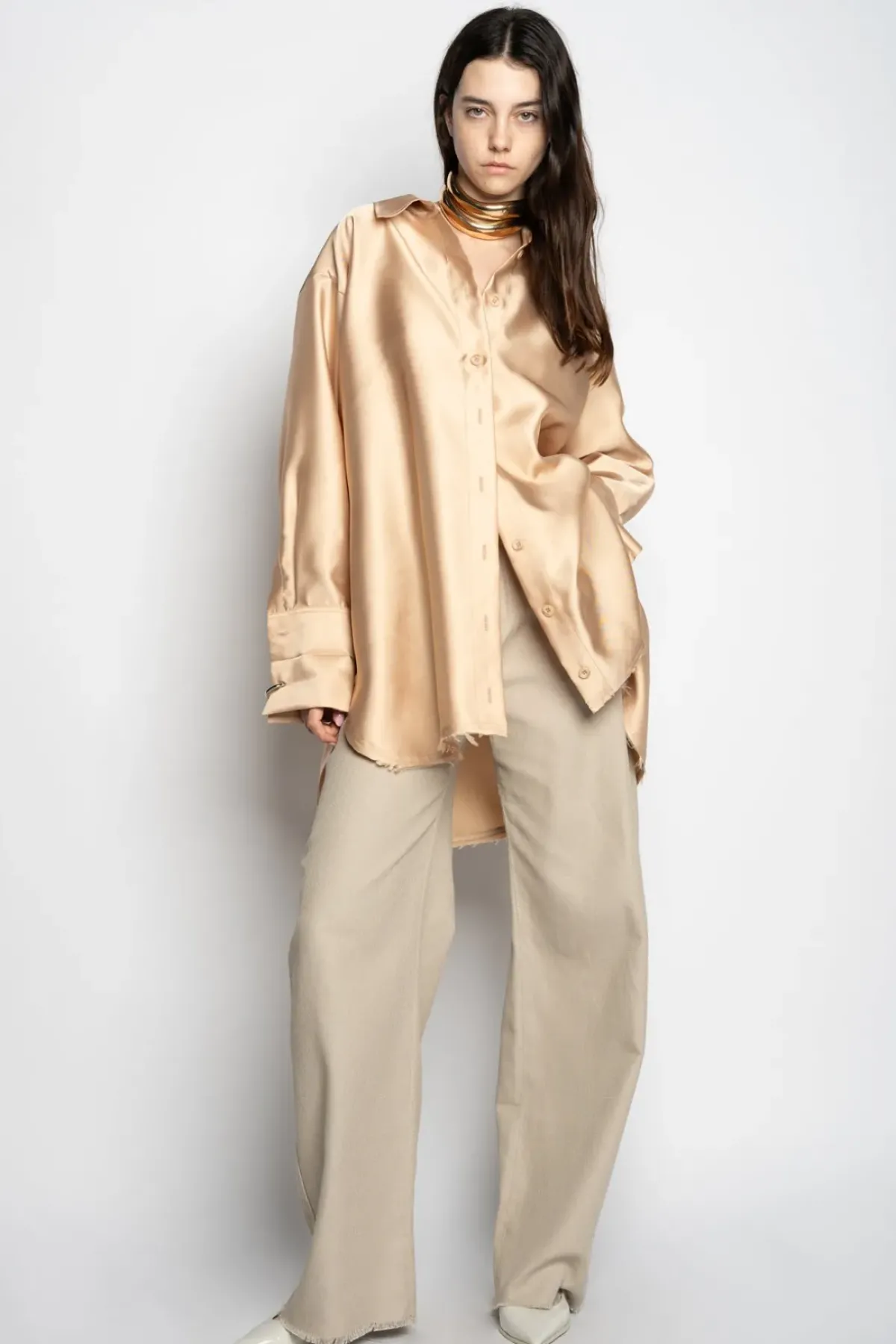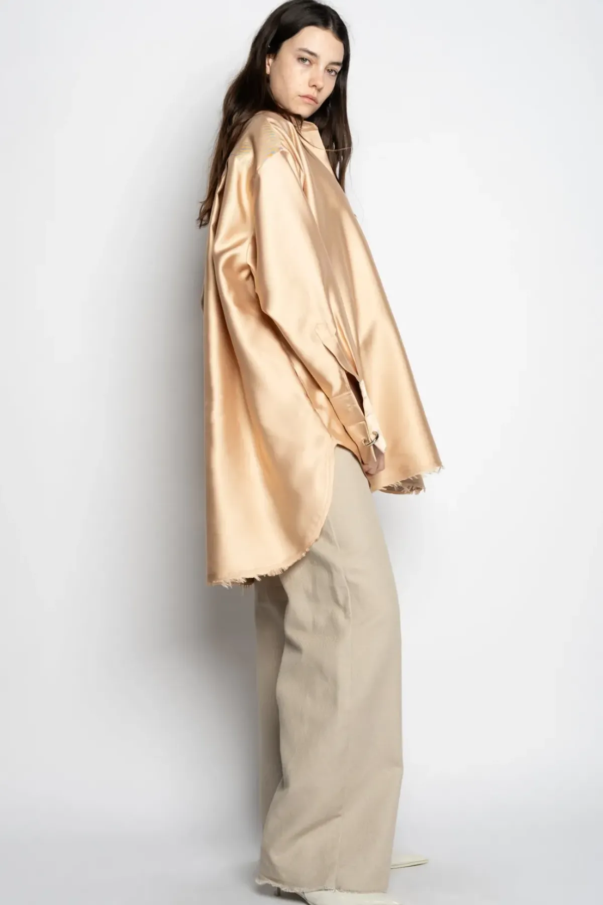 This stylish beige overshirt showcases an air of ease and refinement, featuring long sleeves, a pointed collar, prominent cuffs, and a front button closure.