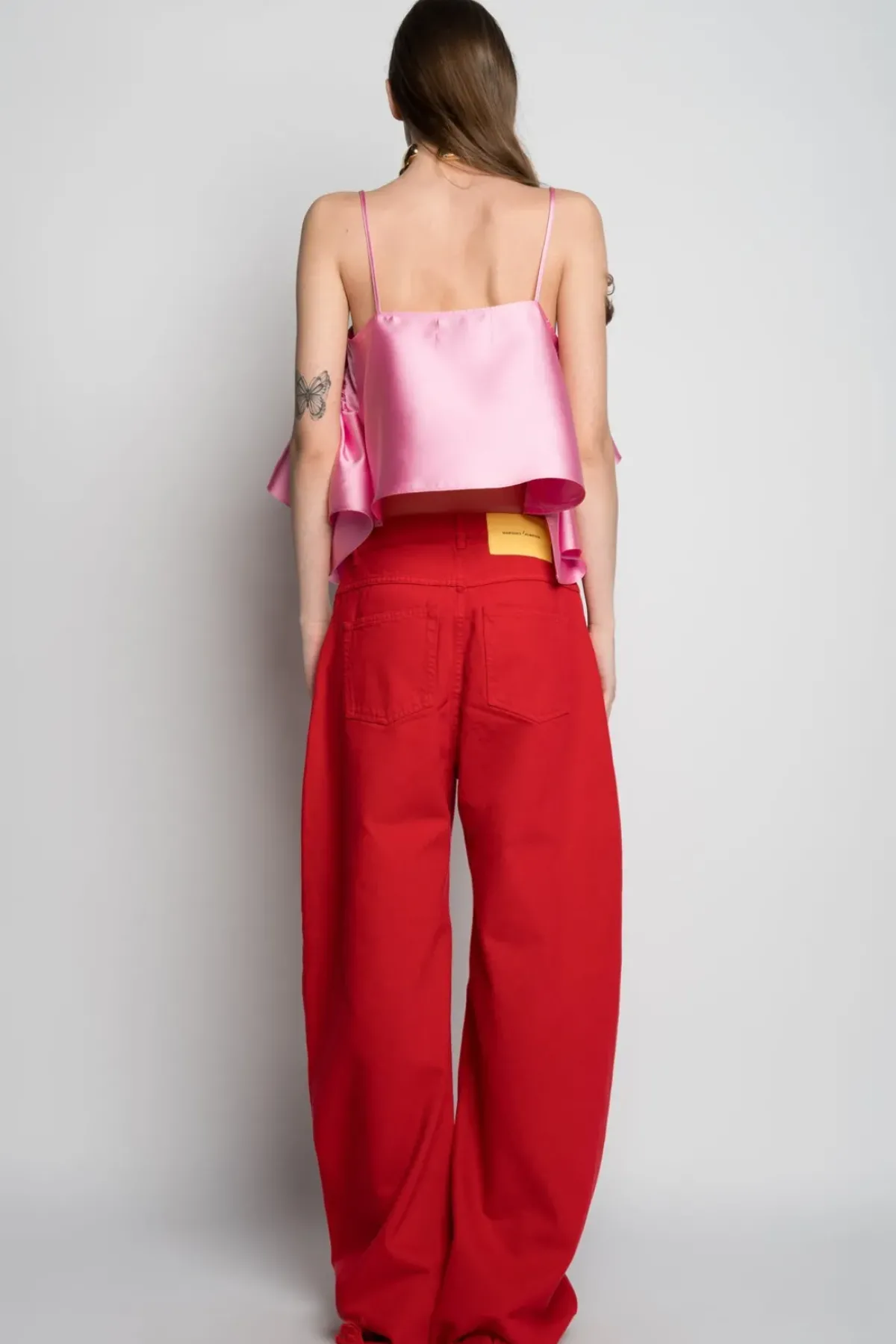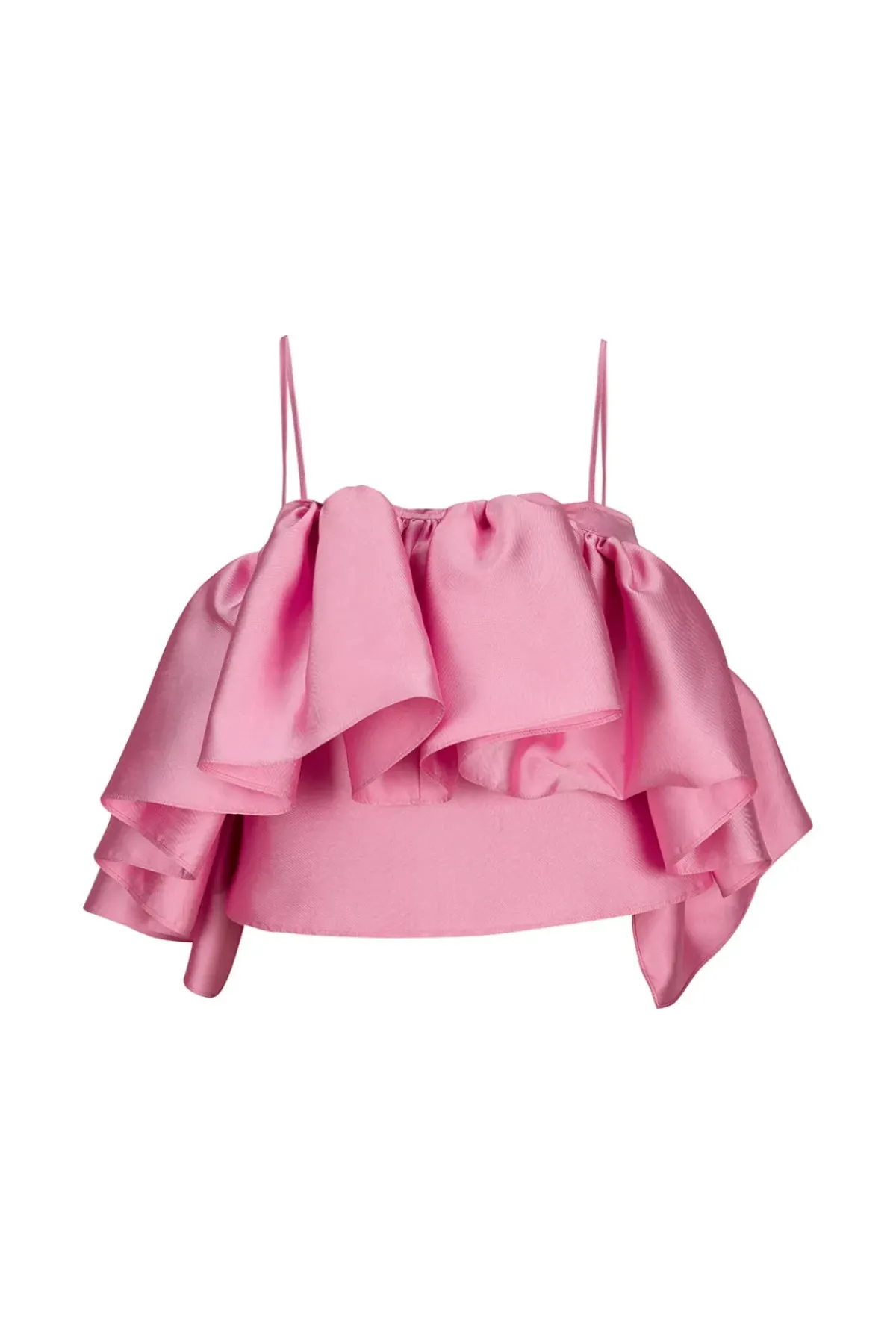 Upgrade your fashion game with our light pink strappy top crafted from high-quality mikado fabric and embellished with front ruffles. This top will make you stand out from the crowd.