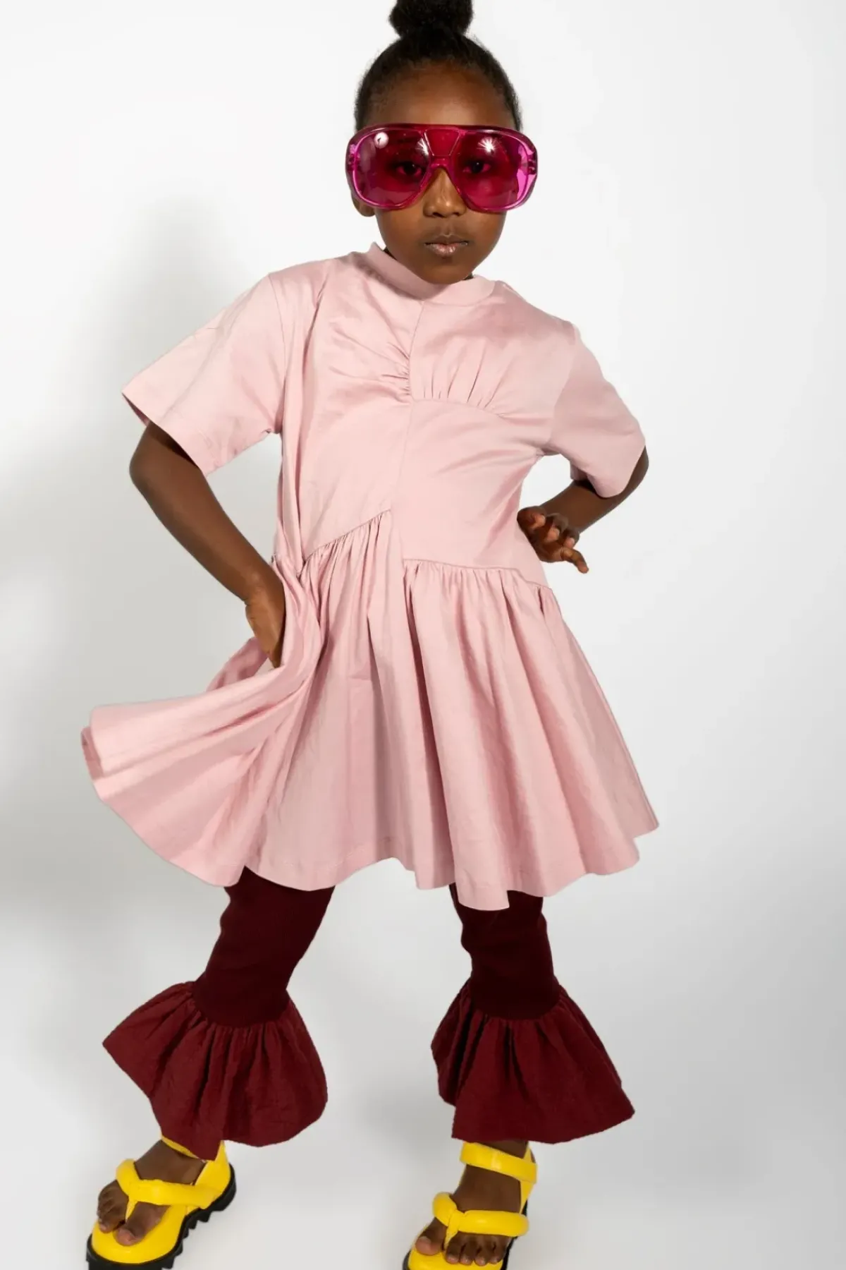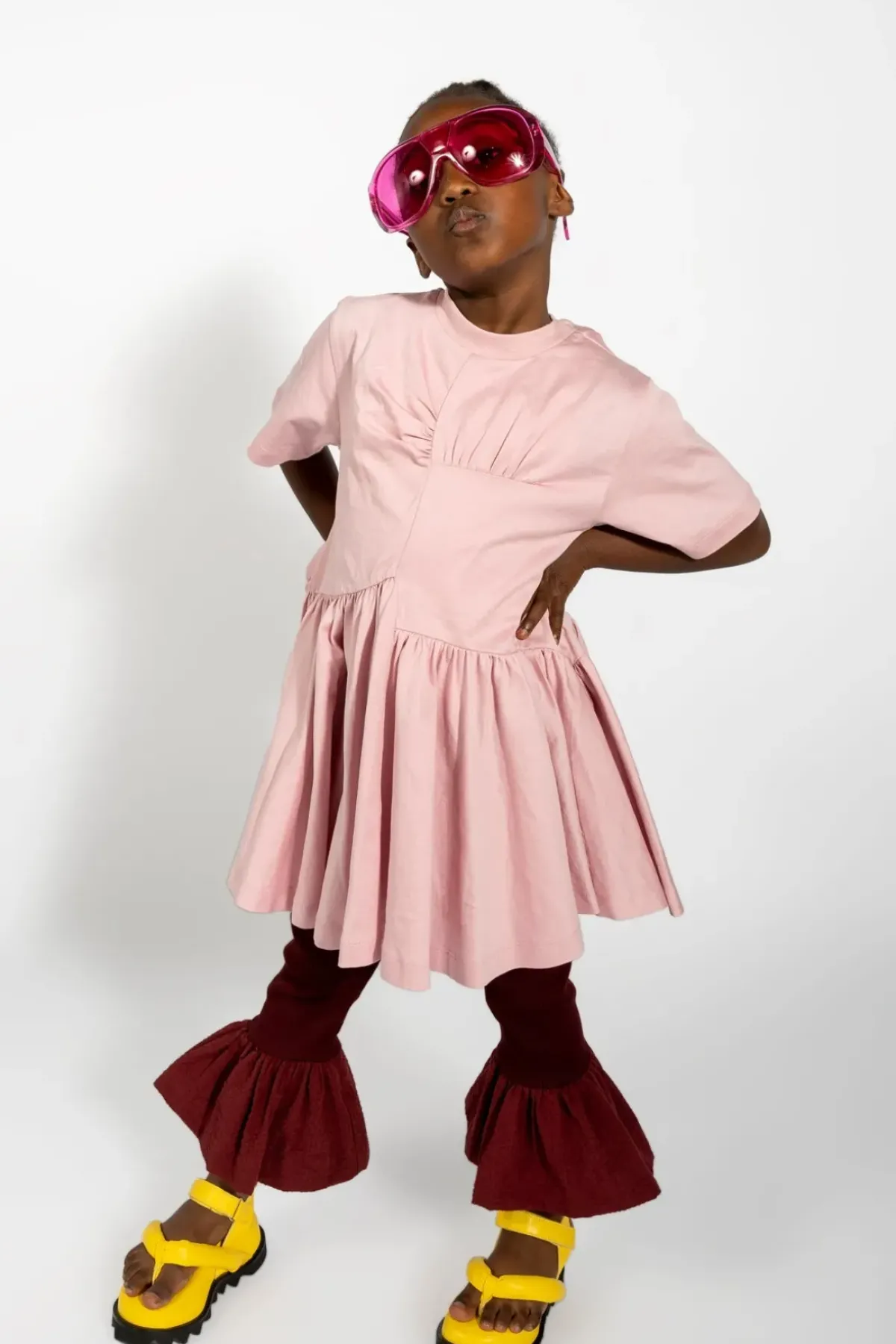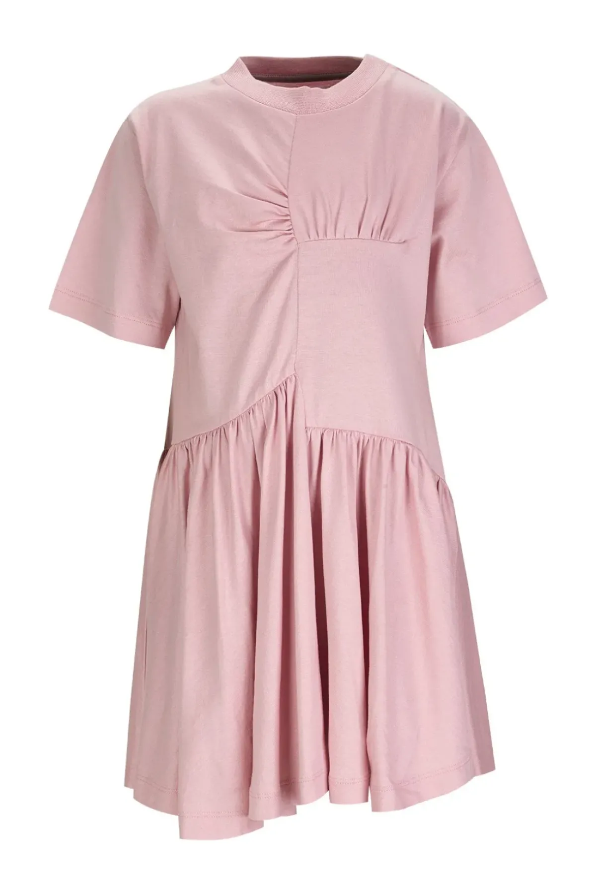 Jersey t-shirt dress made of pink organic cotton with round neck, short sleeves and ruflled hem.