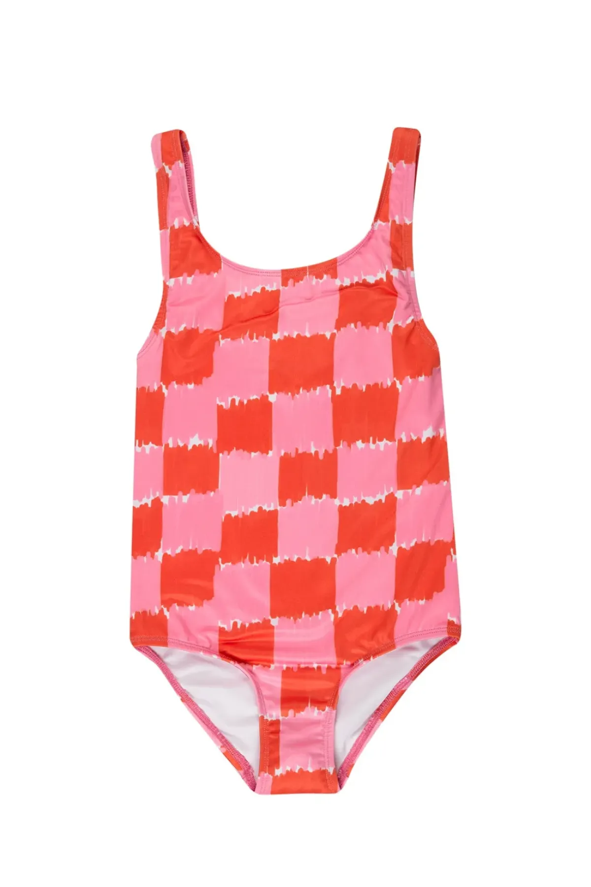 Dive into style with this fun red and pink gingham swimsuit featuring a U-neckline and elasticated legs – perfect for your little ones!