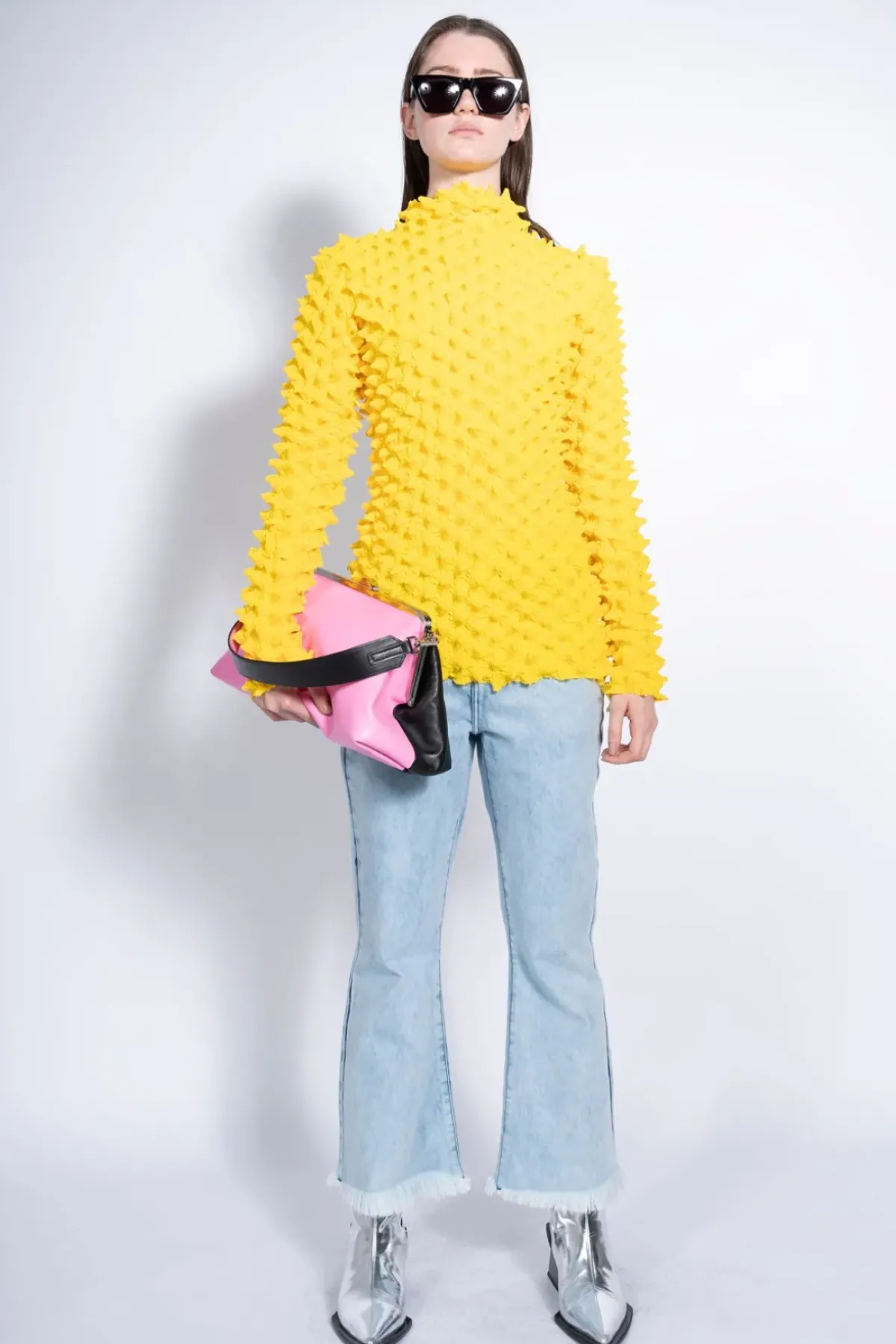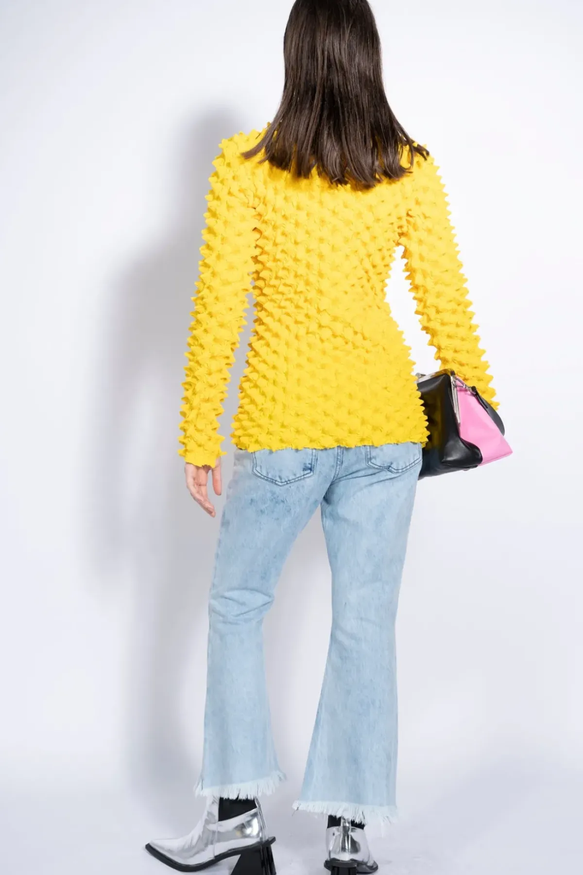 Crafted from a yellow spiked elastic pattern, this top features a long sleeve design and a high neckline for effortless style.