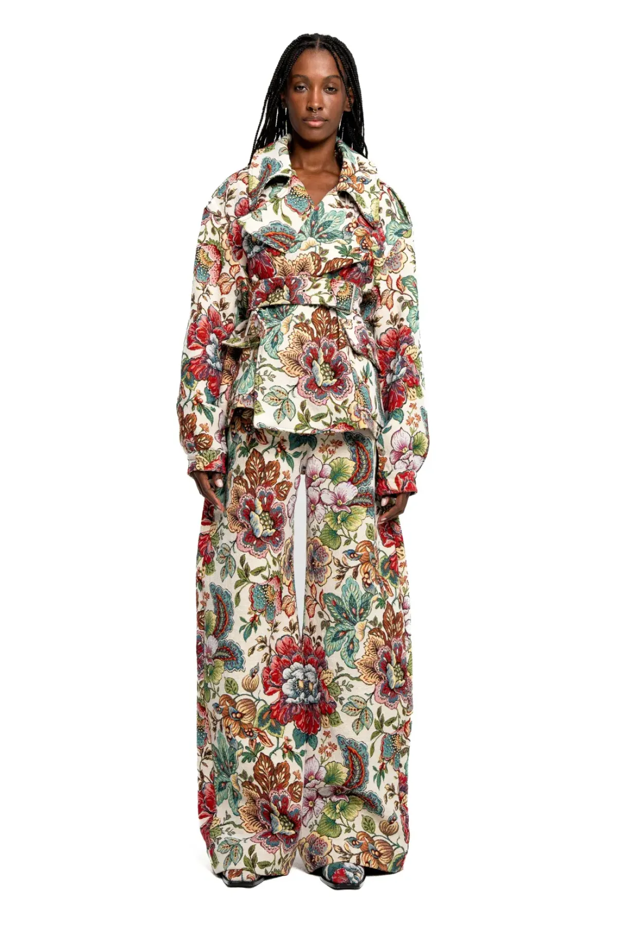Discover the opulent blend of White Floral Brocade Boyfriend Trousers. With a classic 5 pocket layout, a relaxed fit and unfinished hems, these trousers radiate effortless elegance and charm.