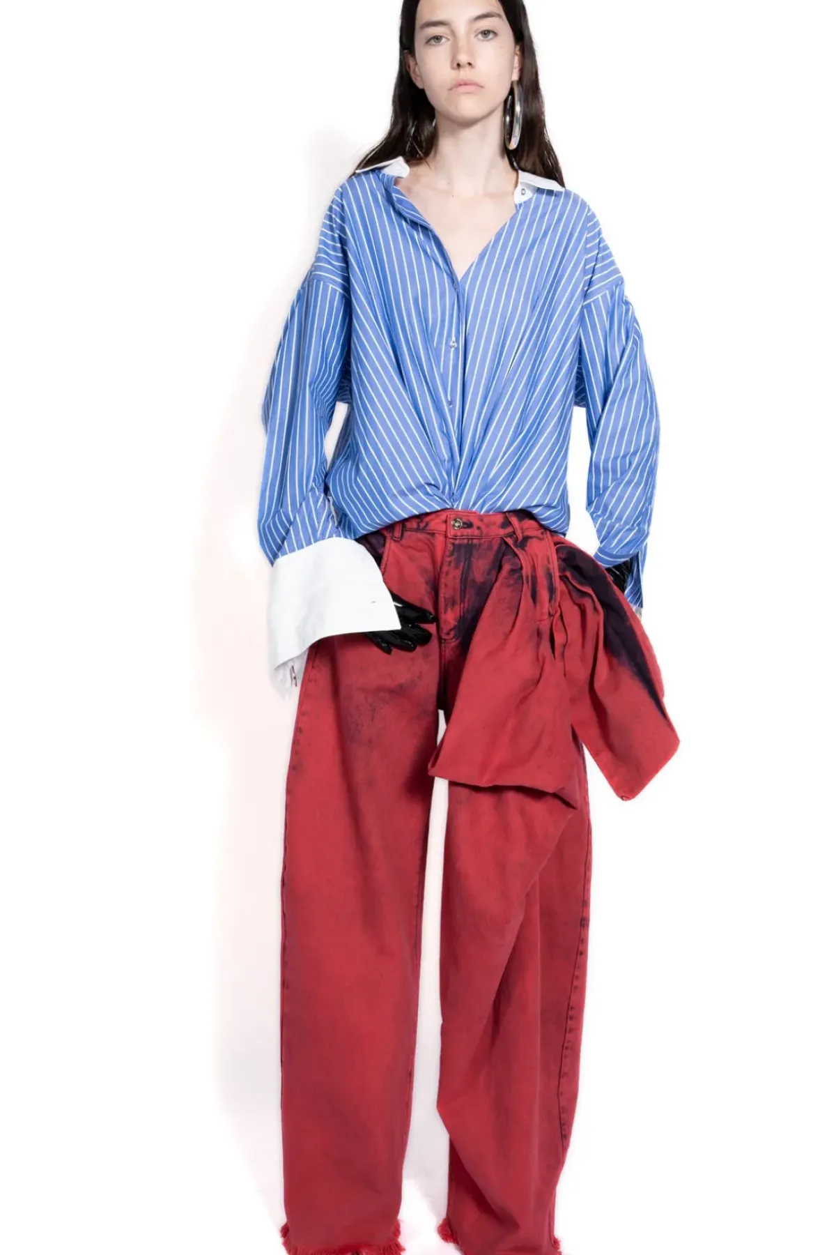 Introducing our Red Boyfriend Trousers With Big Bow – relaxed fit, dropped waist and high-rise make these wide-leg jeans your go-to for cool comfort. The oversized bow and the raw hems complete the look!