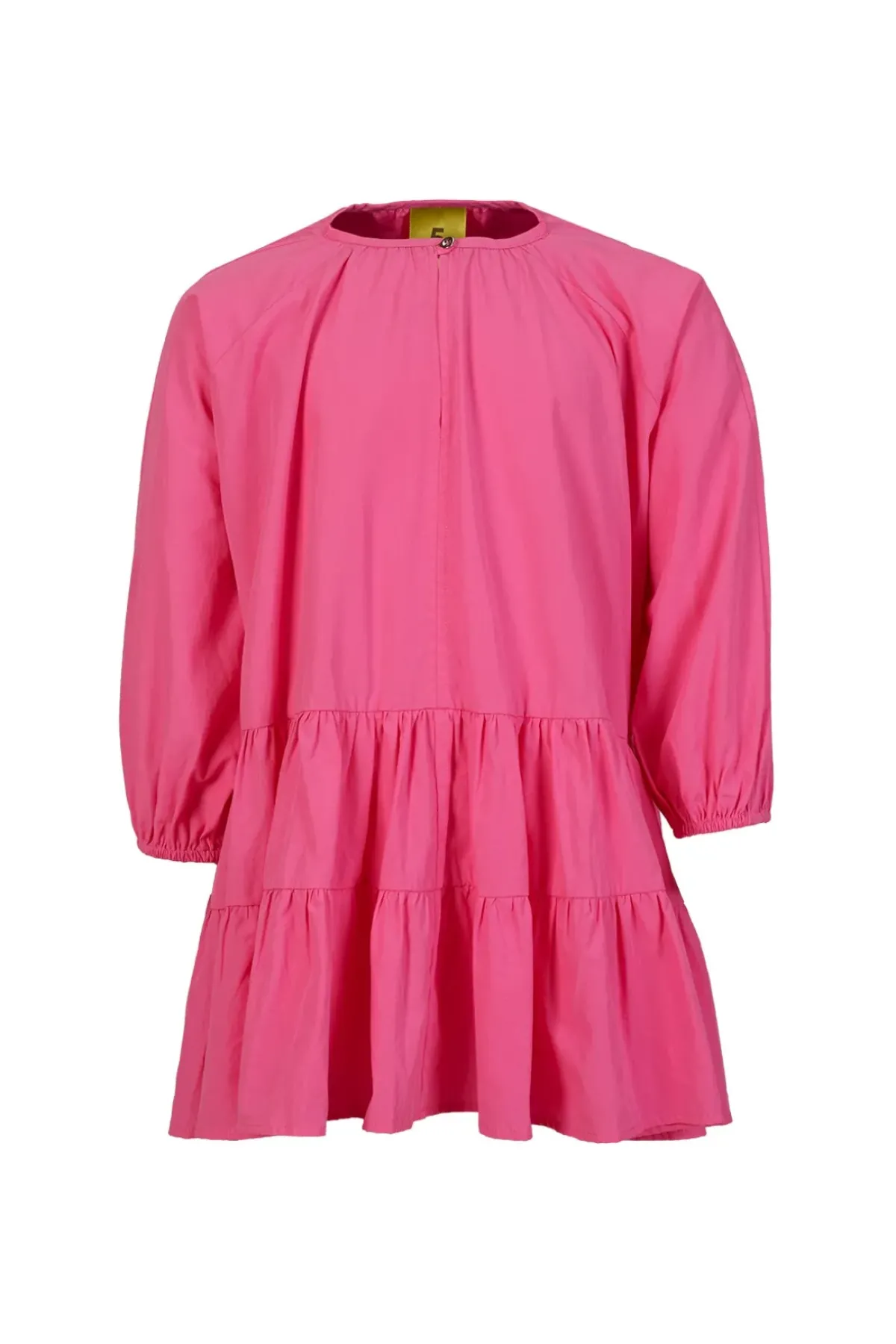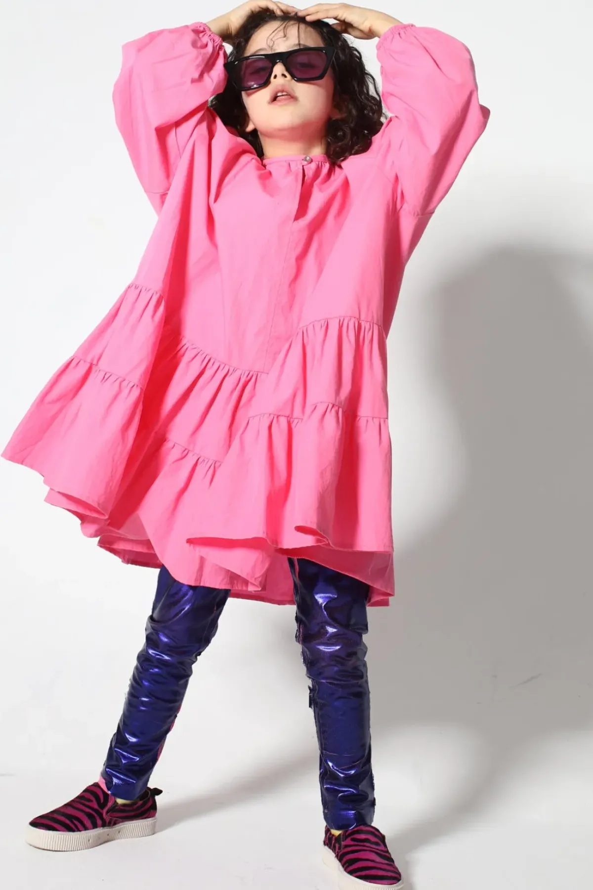 Bright pink cuteness in organic cotton, with a buttoned neckline, raglan-cut long sleeves, tufts, and a waist-and-skirt cinch – all for your kid!
