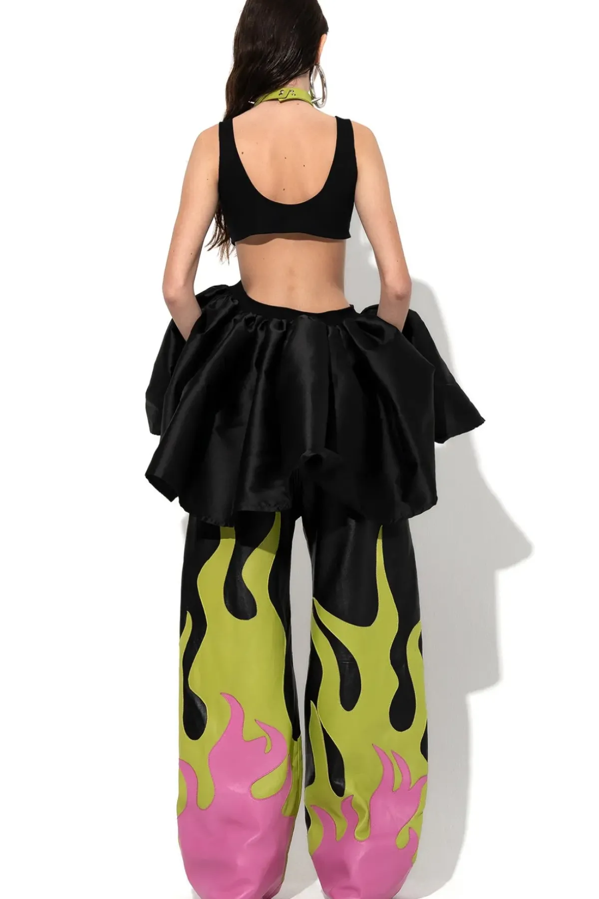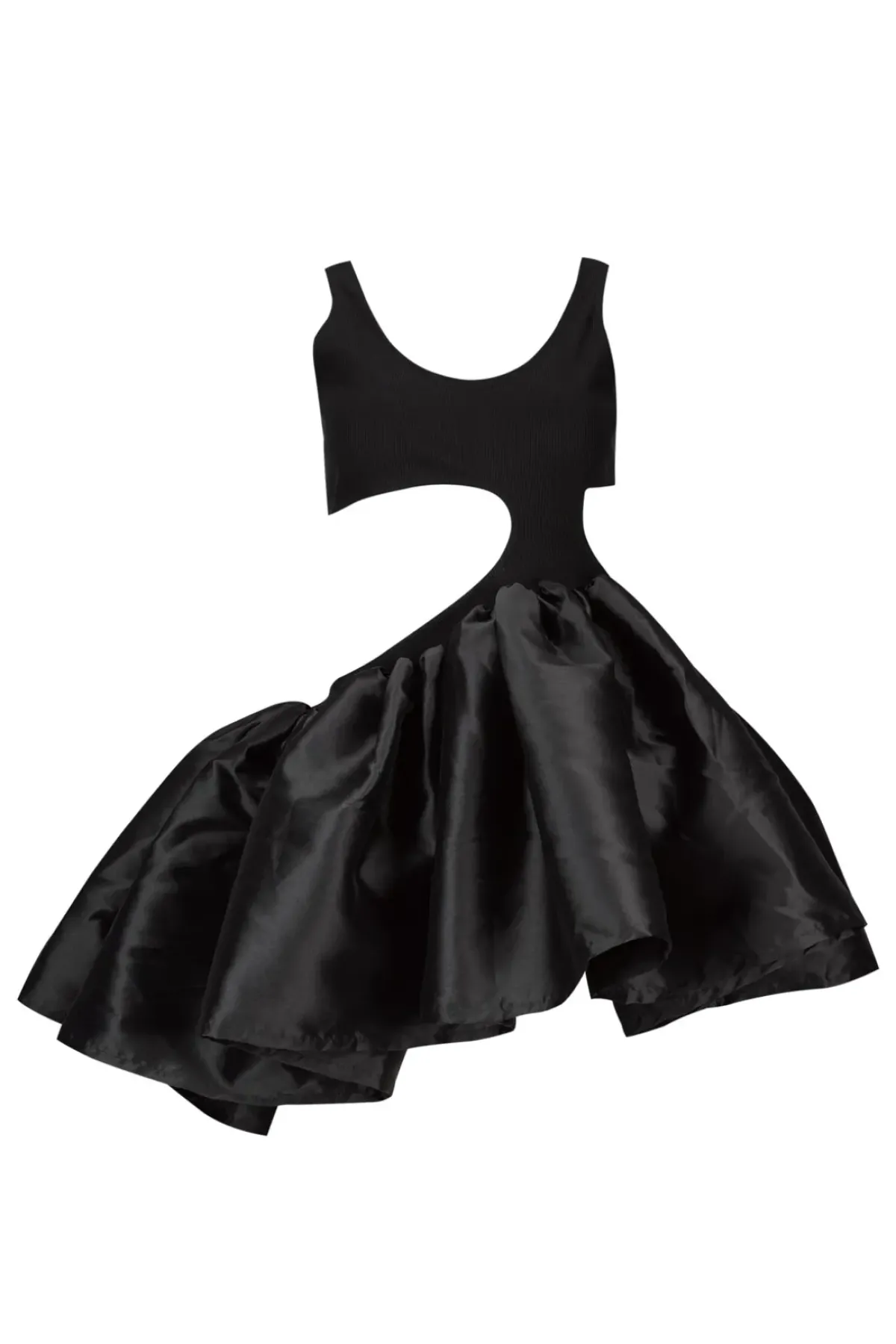 This black tank top features asymmetrical cutouts and a taffeta frill-hem, making it an edgy yet elegant piece!