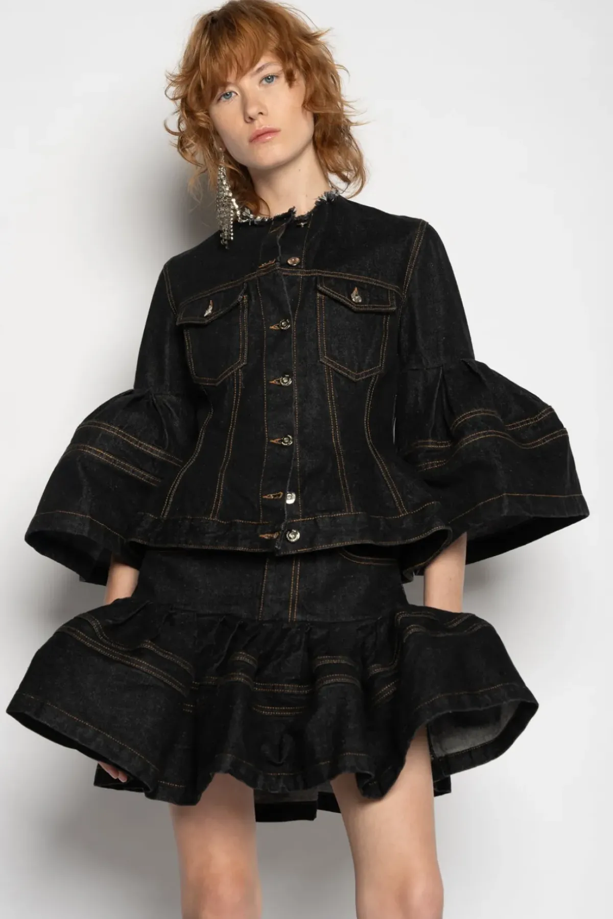 Experience the allure of our black denim short skirt, complete with a playful flounce hem and striking contrasting stitching.
