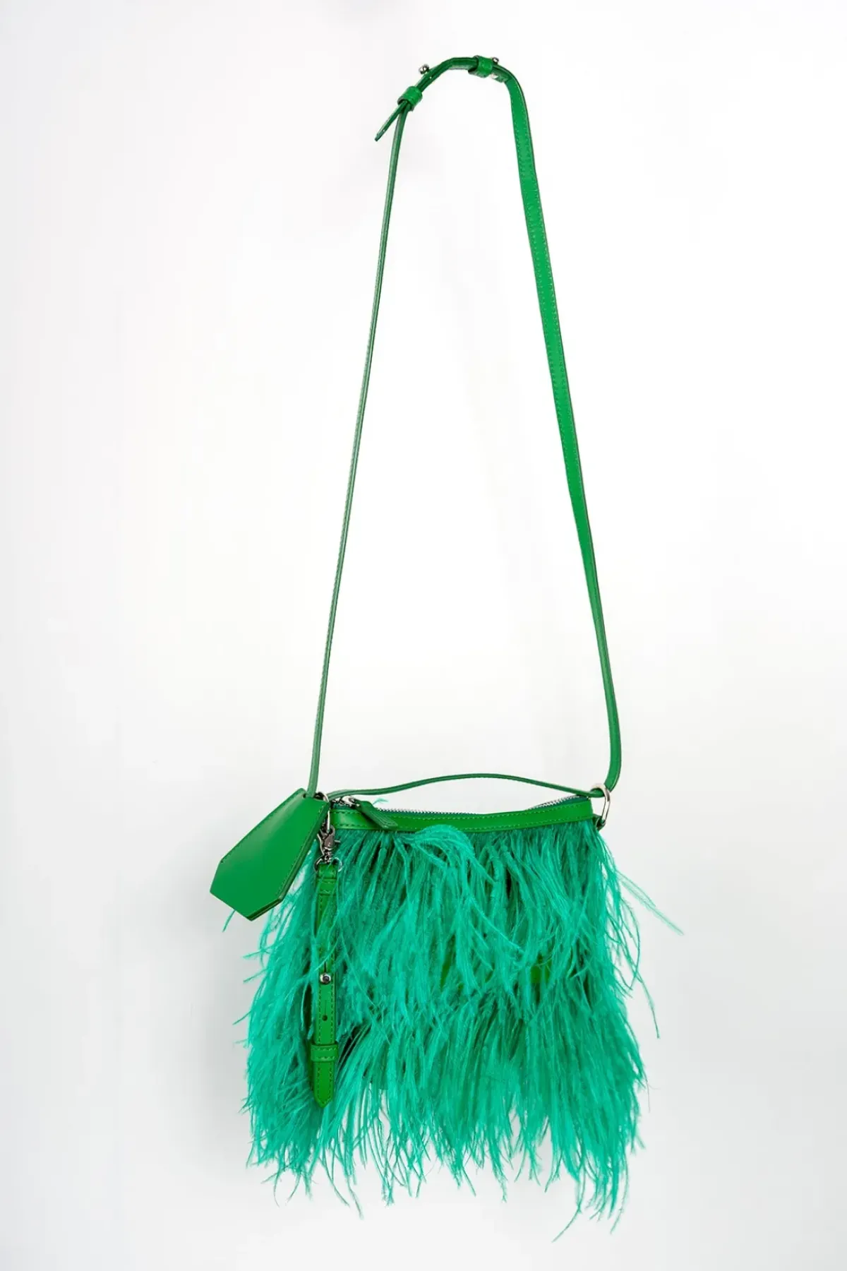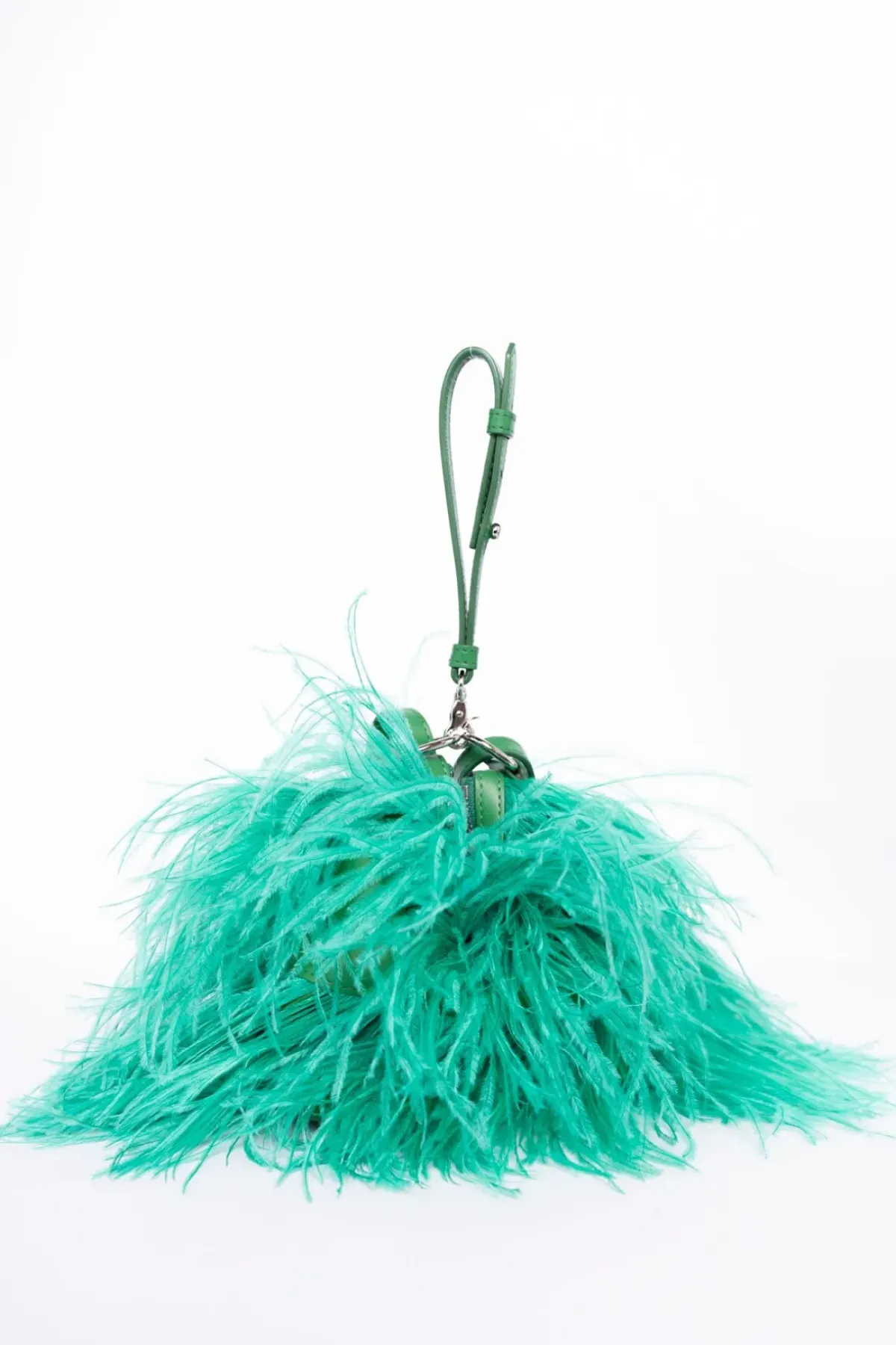 A stylish leather bag, adorned with soft, delicate green feathers. Boasting a secure zip closure and one inner pocket, this bag can be worn as a crossbody, a handbag or around the wrist as a clutch.