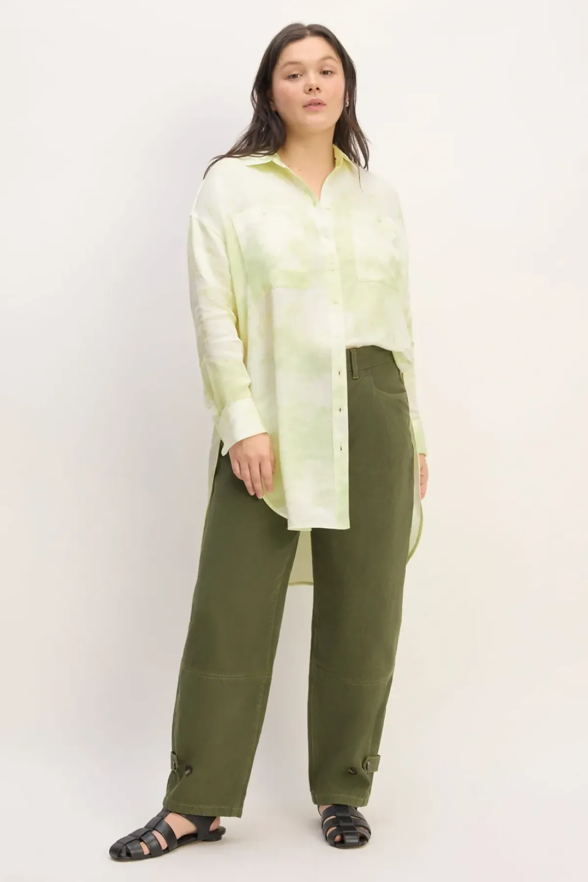 A green tie-dye satin oversized shirt awaits! With its long sleeves, button-up front, front pockets and oversized fit, this must-have piece will be your new go-to.