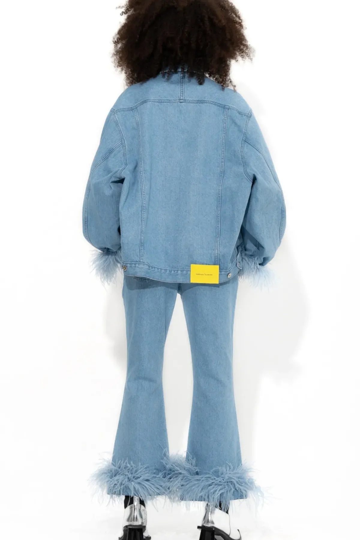 This denim light blue jacket is a wardrobe must-have! Featuring a point collar and front button closure, it's elevated by removable light blue feather details on the cuffs for a truly unique look.