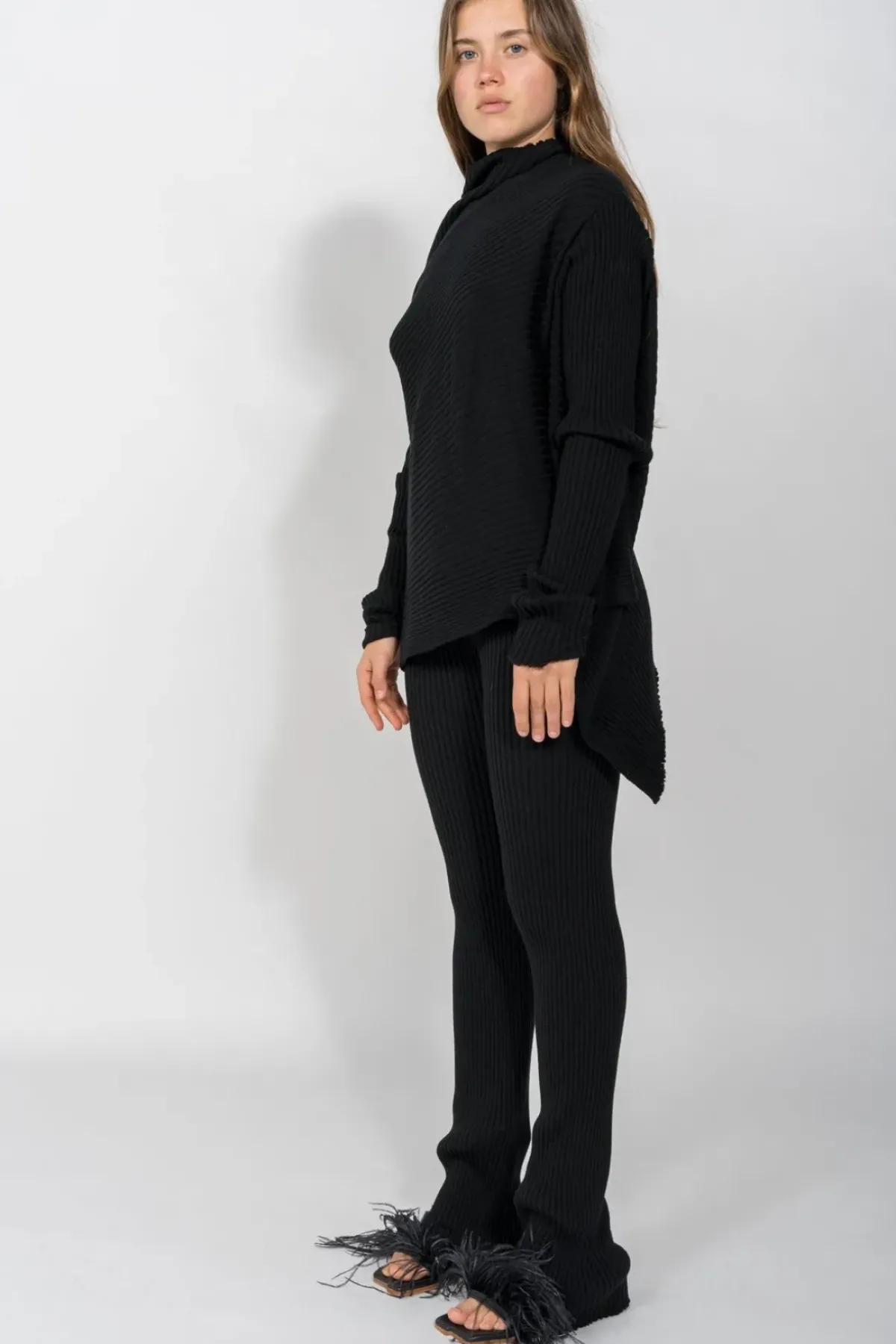 These black merino wool trousers boast an elasticated waistband with a drawstring fastening, a high waist and raw hem. The stylish panelling adds a sophisticated touch.