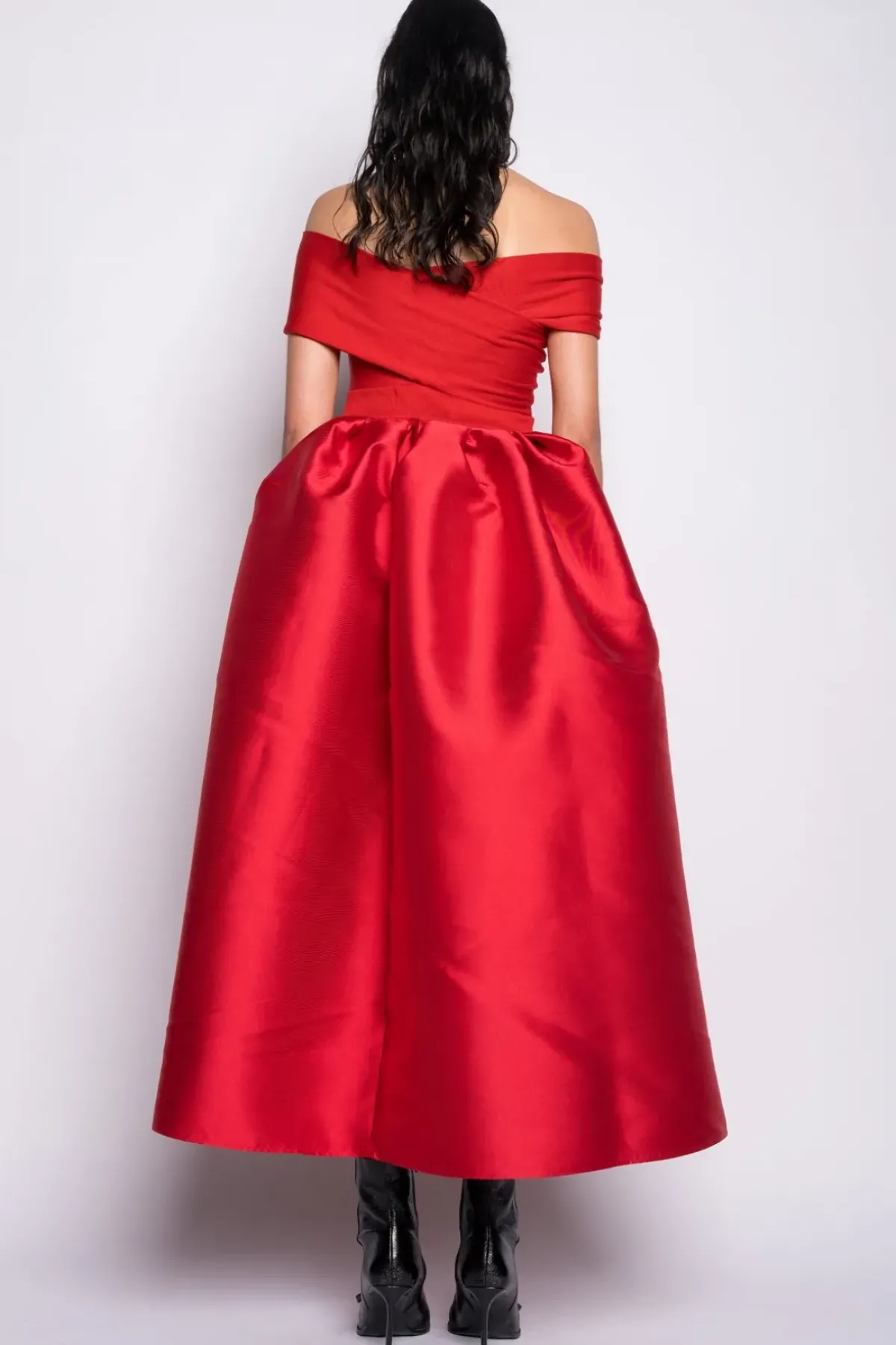 This dress features a vibrant red off-shoulder top in rib jersey with a draped design, paired with full midi-length skirt in luxurious mikado fabric.