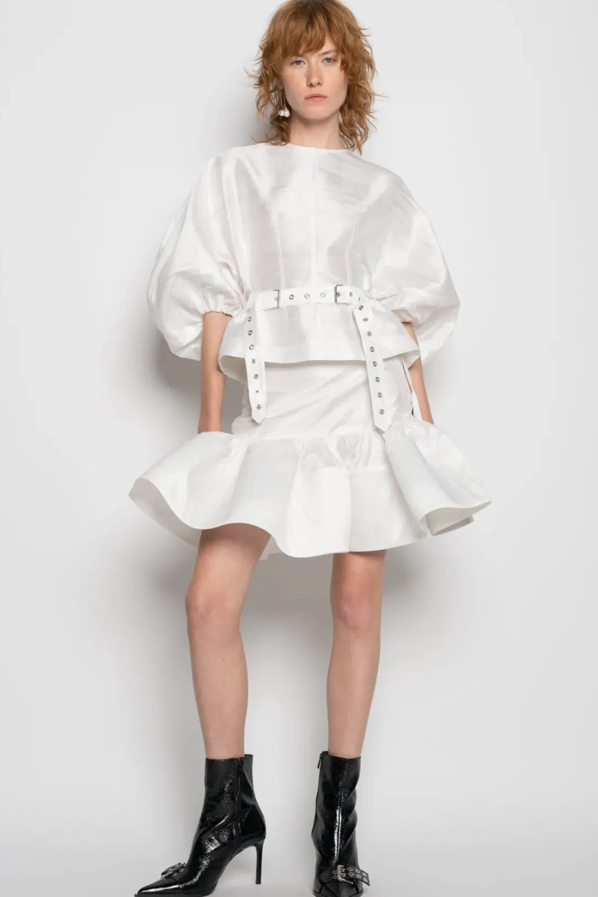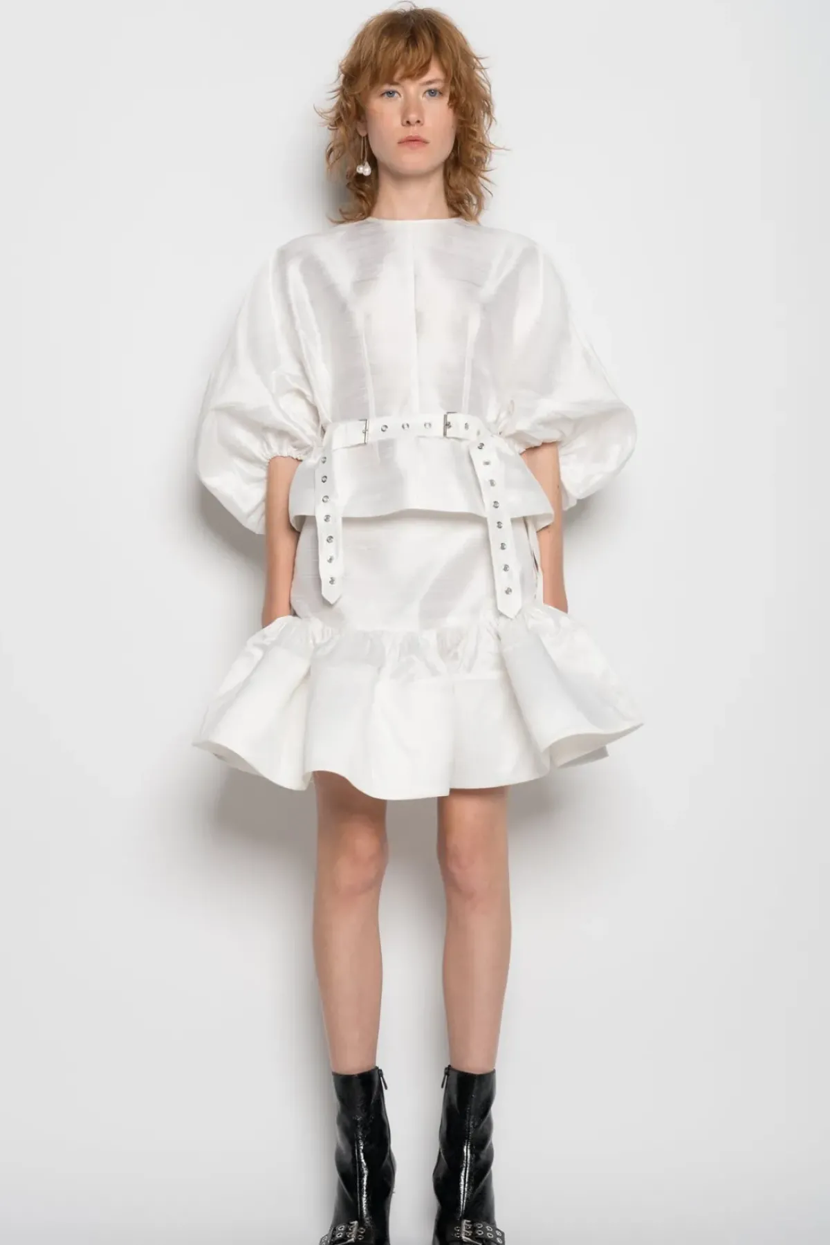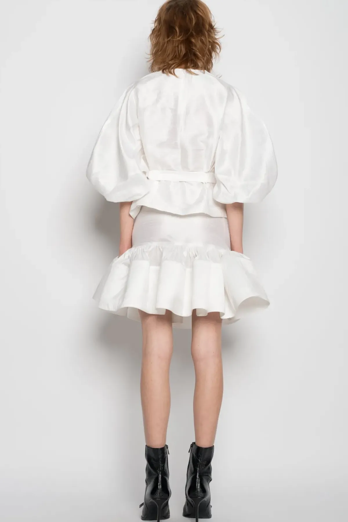 Experience the luxurious feel of our white round sleeve top, made with premium silk doupion fabric and featuring a stylish cinched belt. Elevate your wardrobe with this versatile and elegant piece.