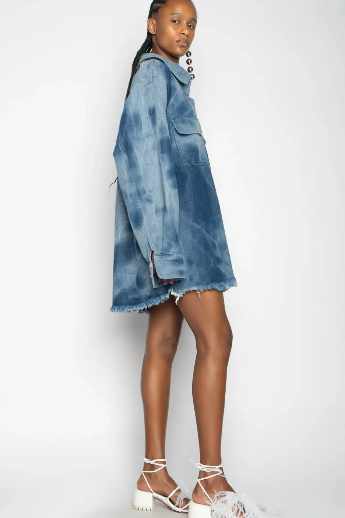 Oversized shirt in blue tie dye denim, signature raw hem and front buttons! Its stylish design makes it a wardrobe essential!