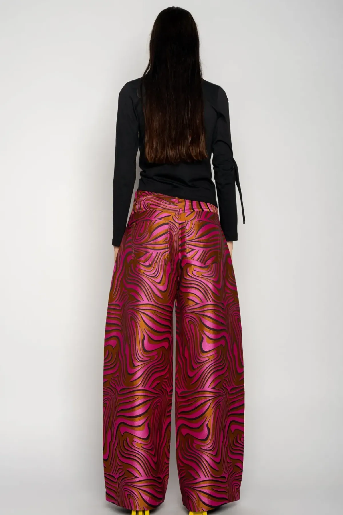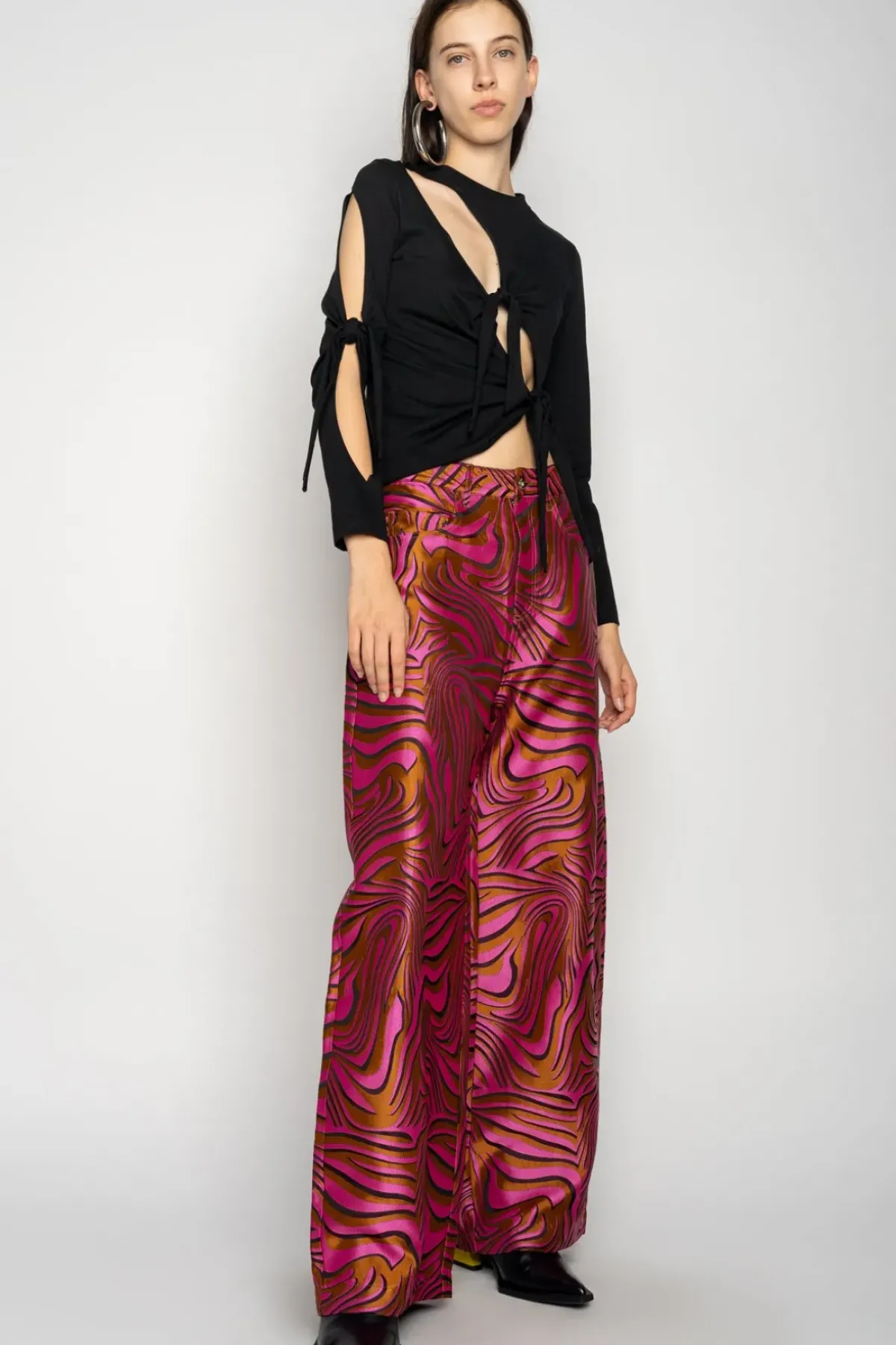 Flaunt a stylish look wearing these classic M'A 5-pocket boyfriend trousers in pink zebra brocade! These wide-leg bottoms present a relaxed fit with a low-slung waistline and rise.