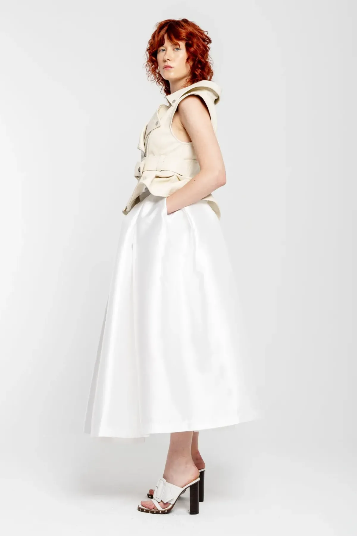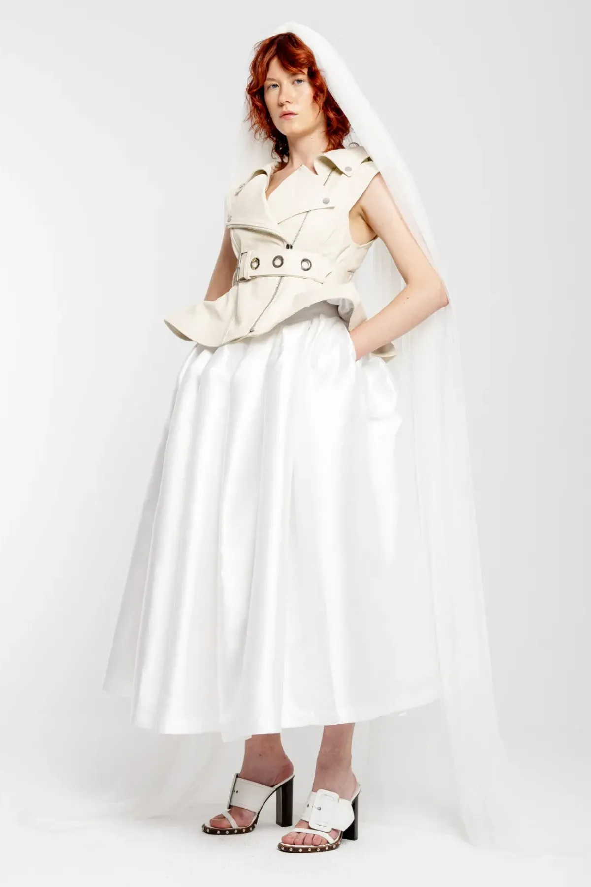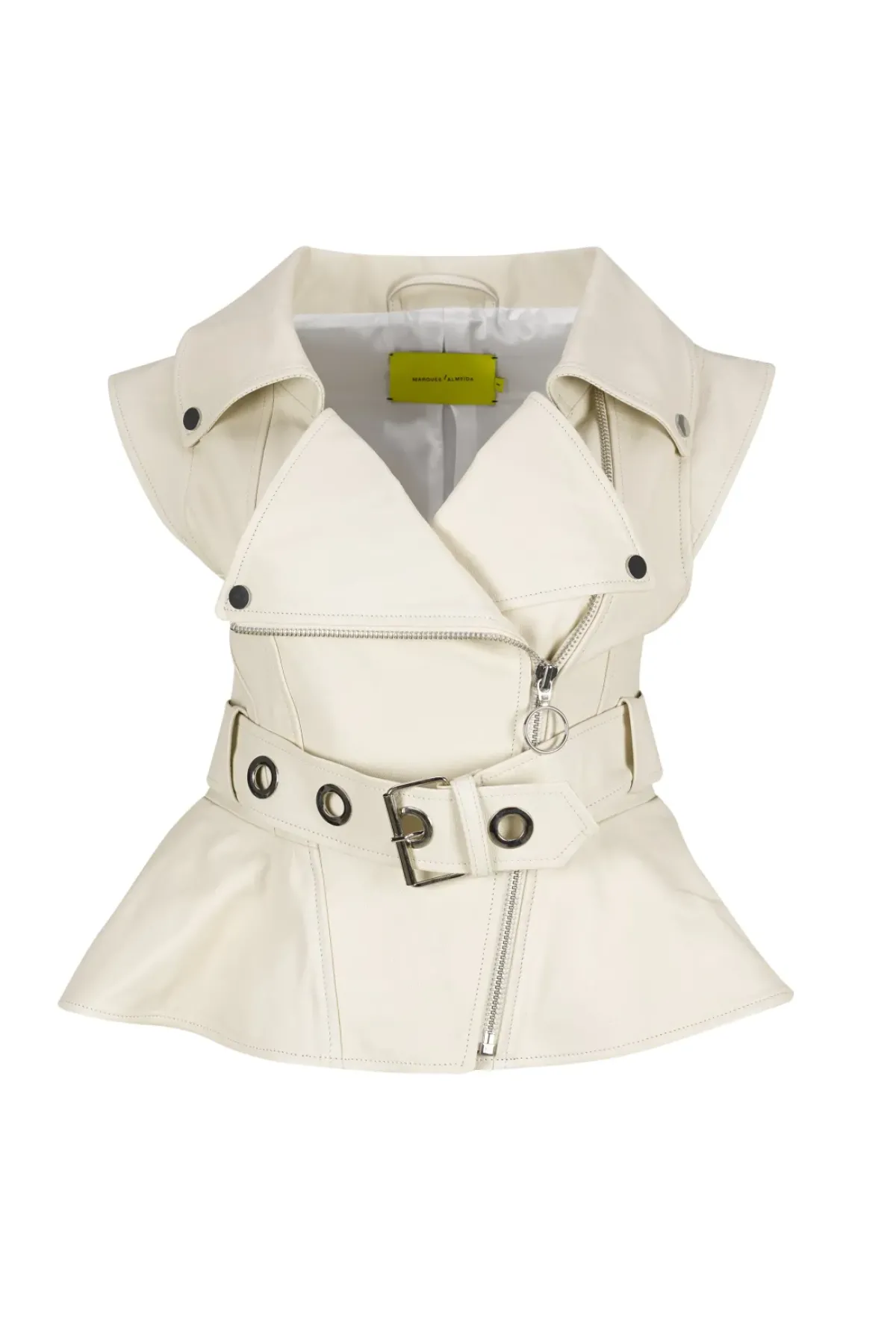 Introducing the perfect statement piece for any fashion-forward bride-to-be: the Off-white Cinched Open Neck Leather Biker Vest! With its off-white color, pointy neck, unique peplum hem and belt closure, this vest is a must-have for your bridal collection. Make a bold statement with this edgy vest.