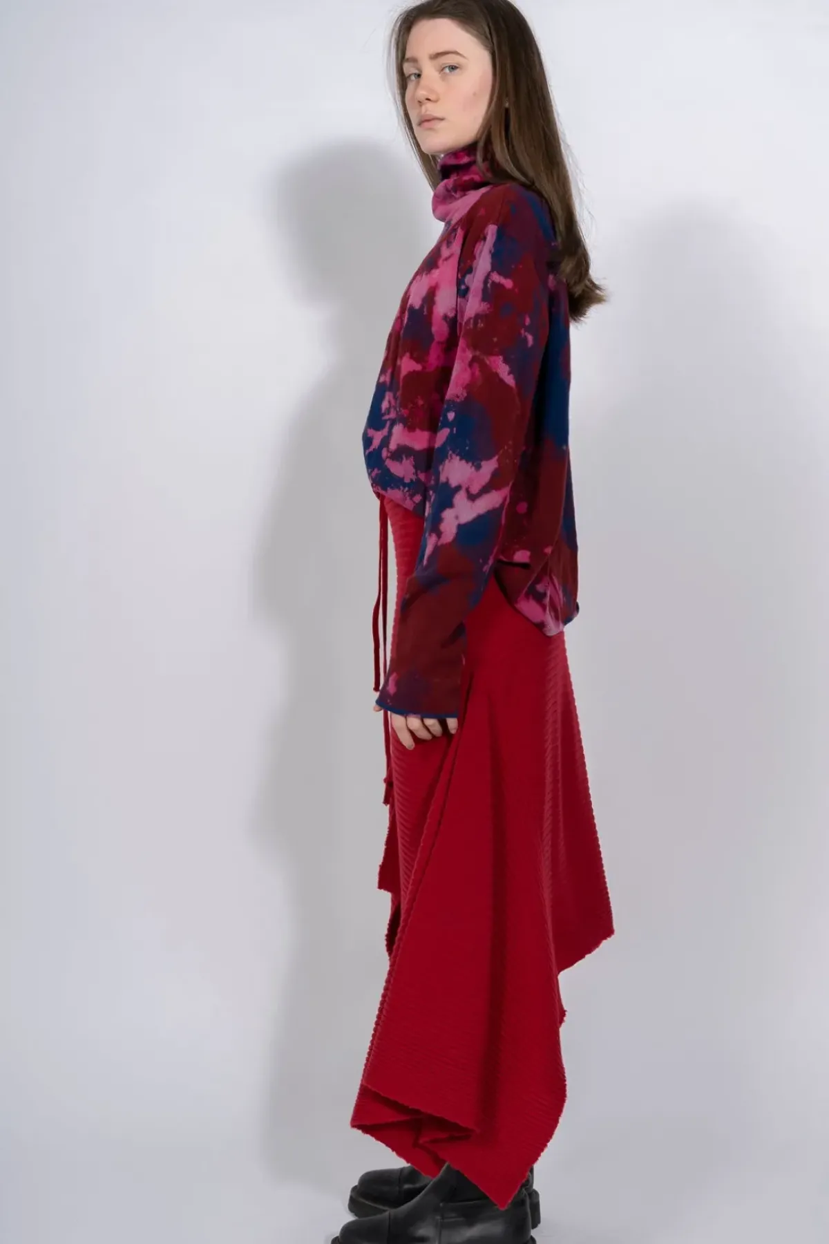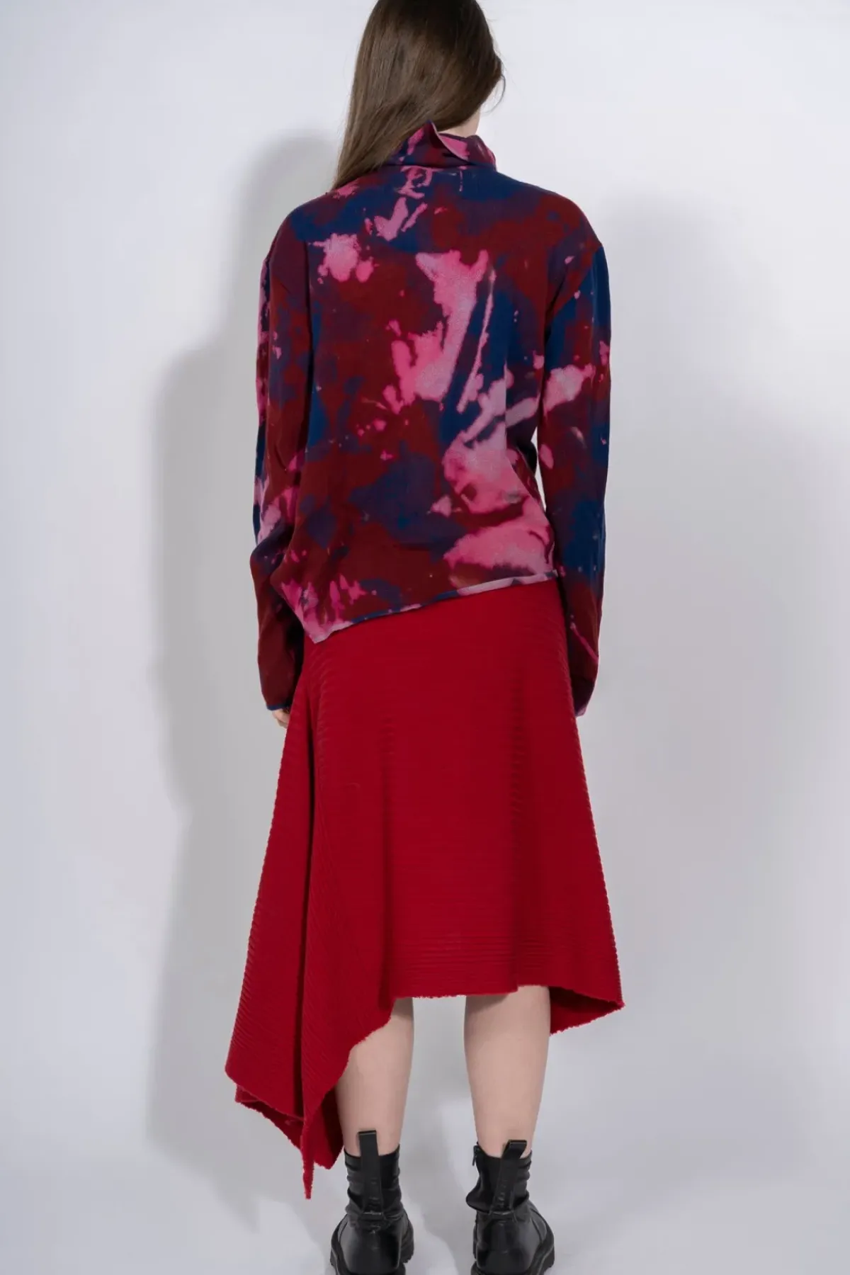 This merino wool skirt features an asymmetrical silhouette, ribbing for texture, and raw hemlines for a draped style.