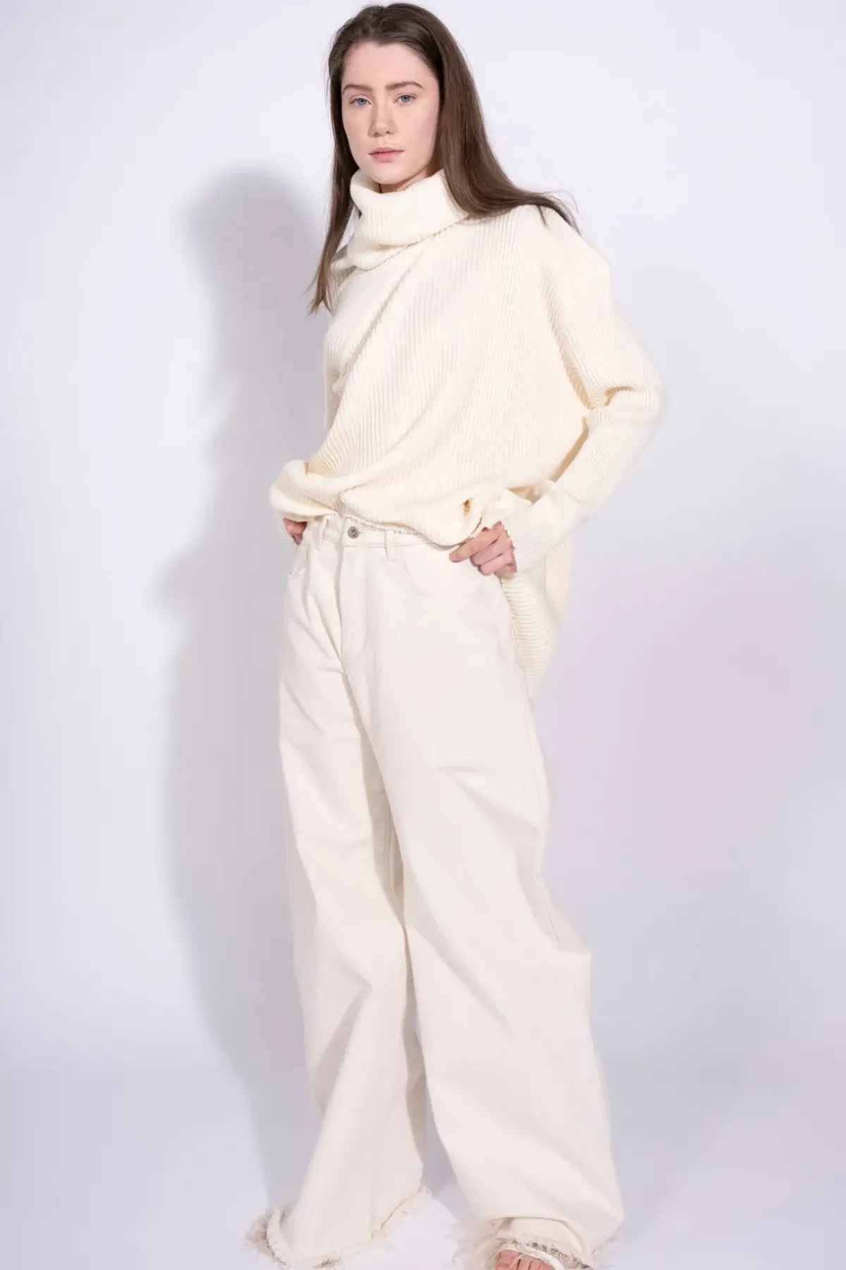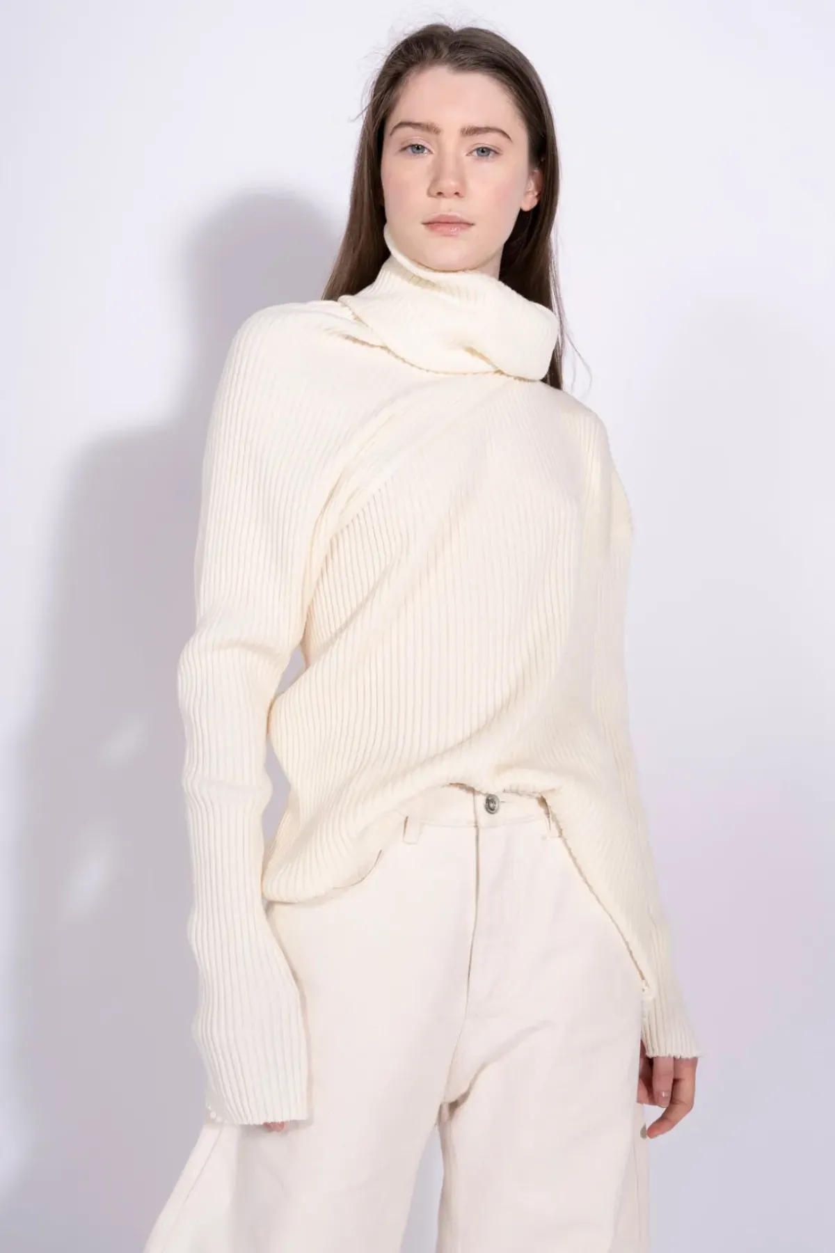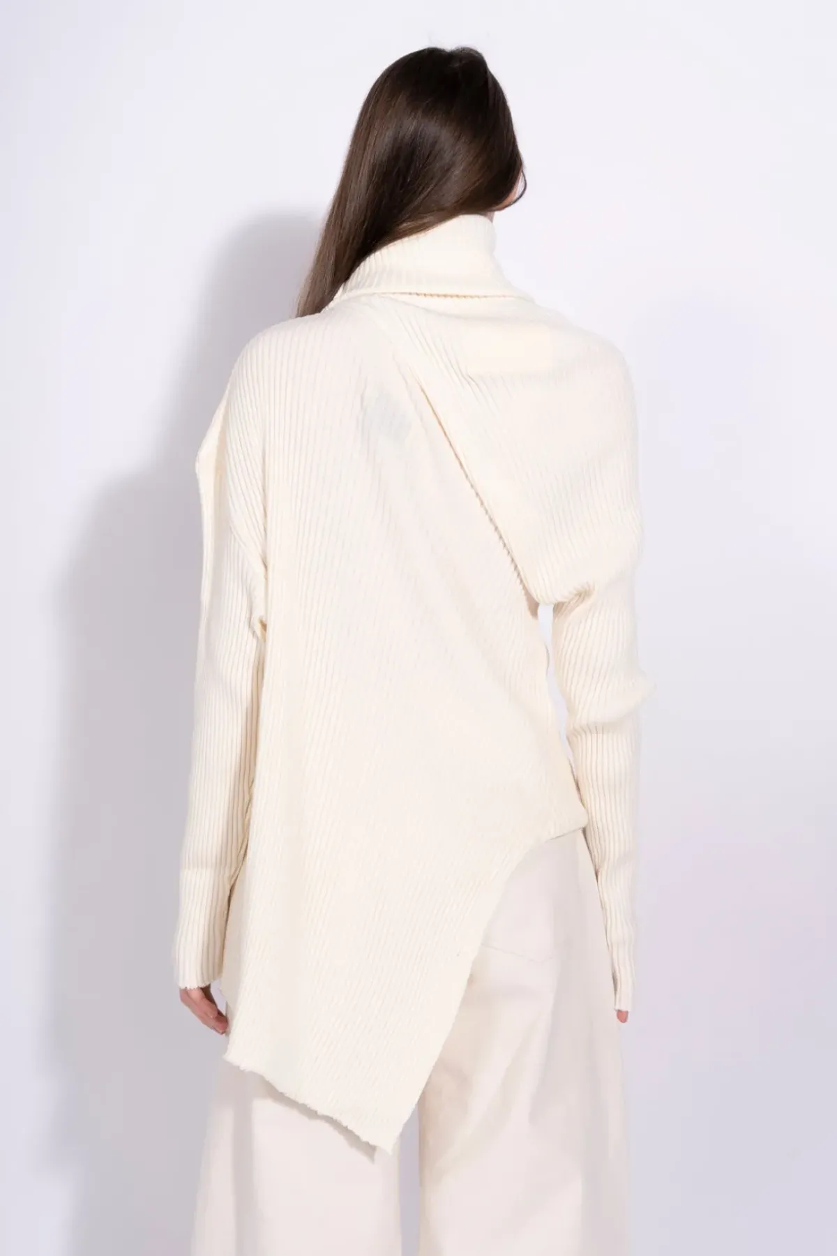 Flaunt off-white elegance in our merino-knit asymmetric turtleneck sweater, featuring a twisted texture, a swooping cowl neck, raw hemlines, and long sleeves.
