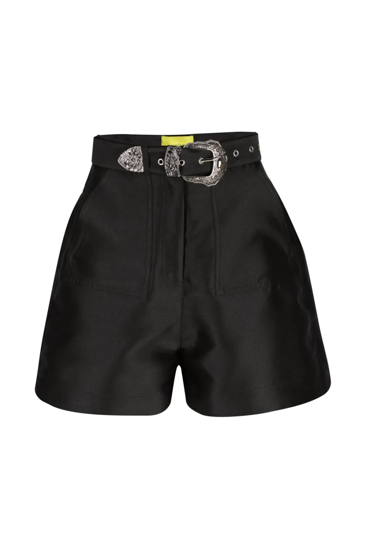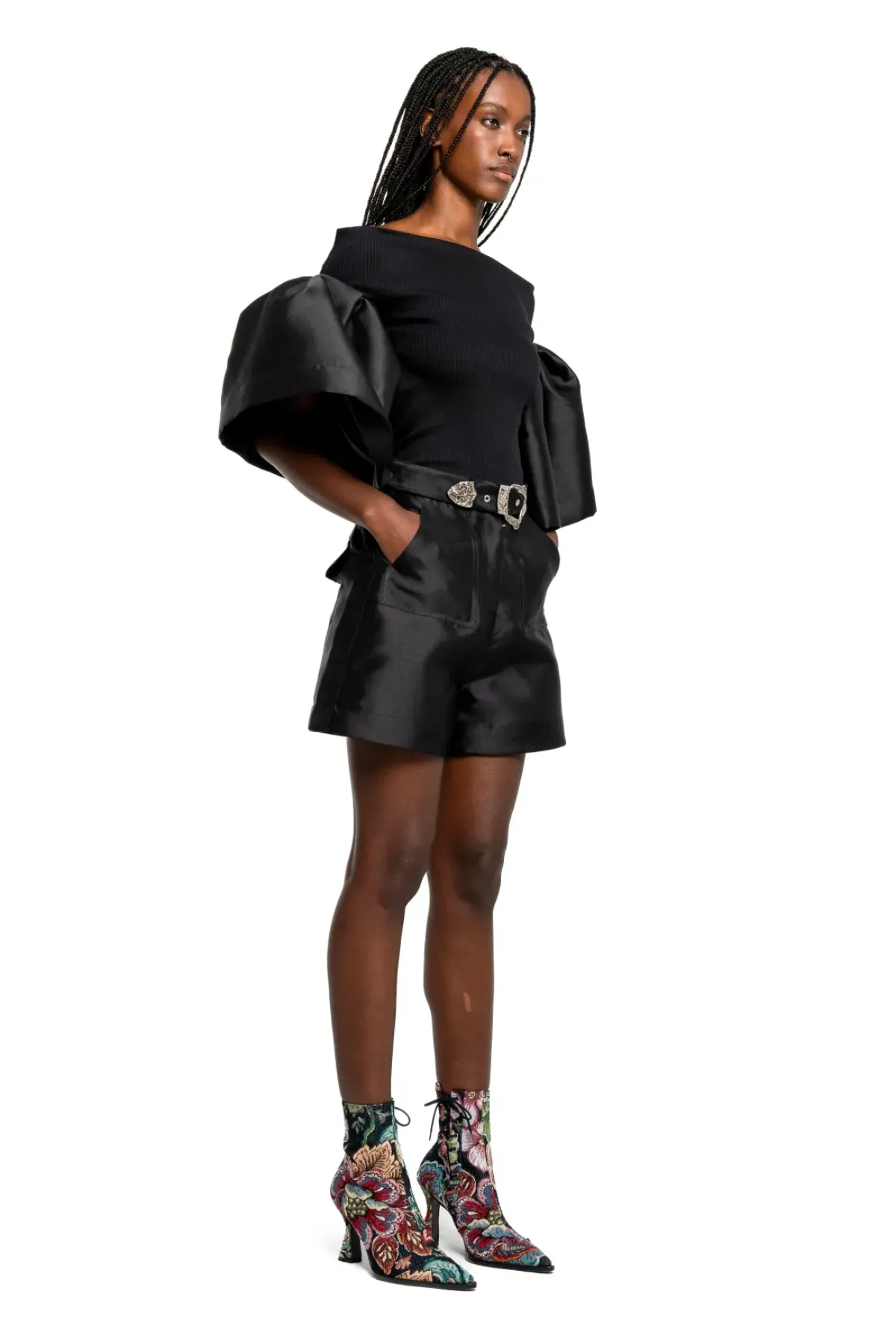 Black Mikado shorts with belt and patch pocket. Designed with a sleek belt and a convenient patch pocket, these shorts offer a stylish and practical way to elevate your wardrobe. Experience the confidence and comfort of our high-quality materials and versatile design.