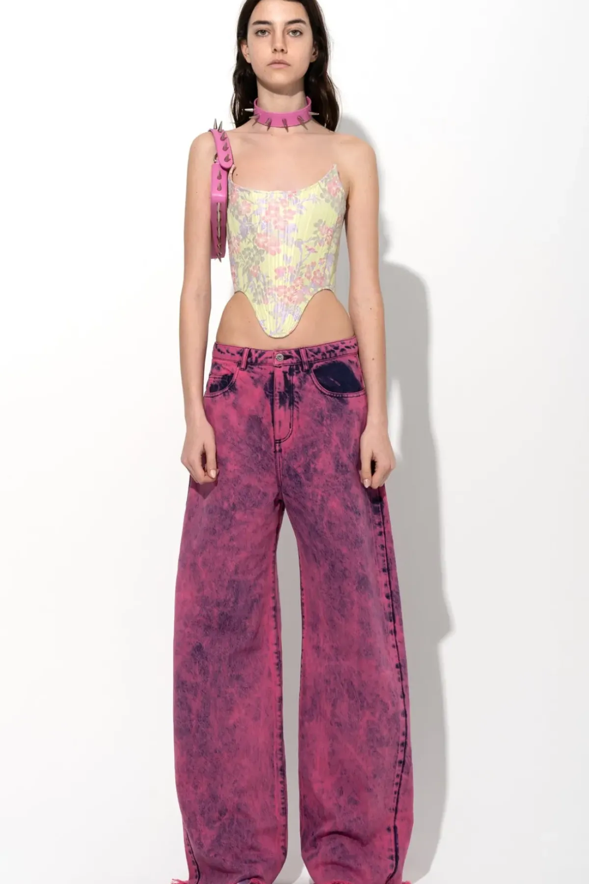Try out our pink denim boyfriend trousersmade with vibrant pink overdye denim, these stylish wide-leg jeans have a relaxed fit and dropped waist and rise, giving you a timeless and effortlessly cool look.
