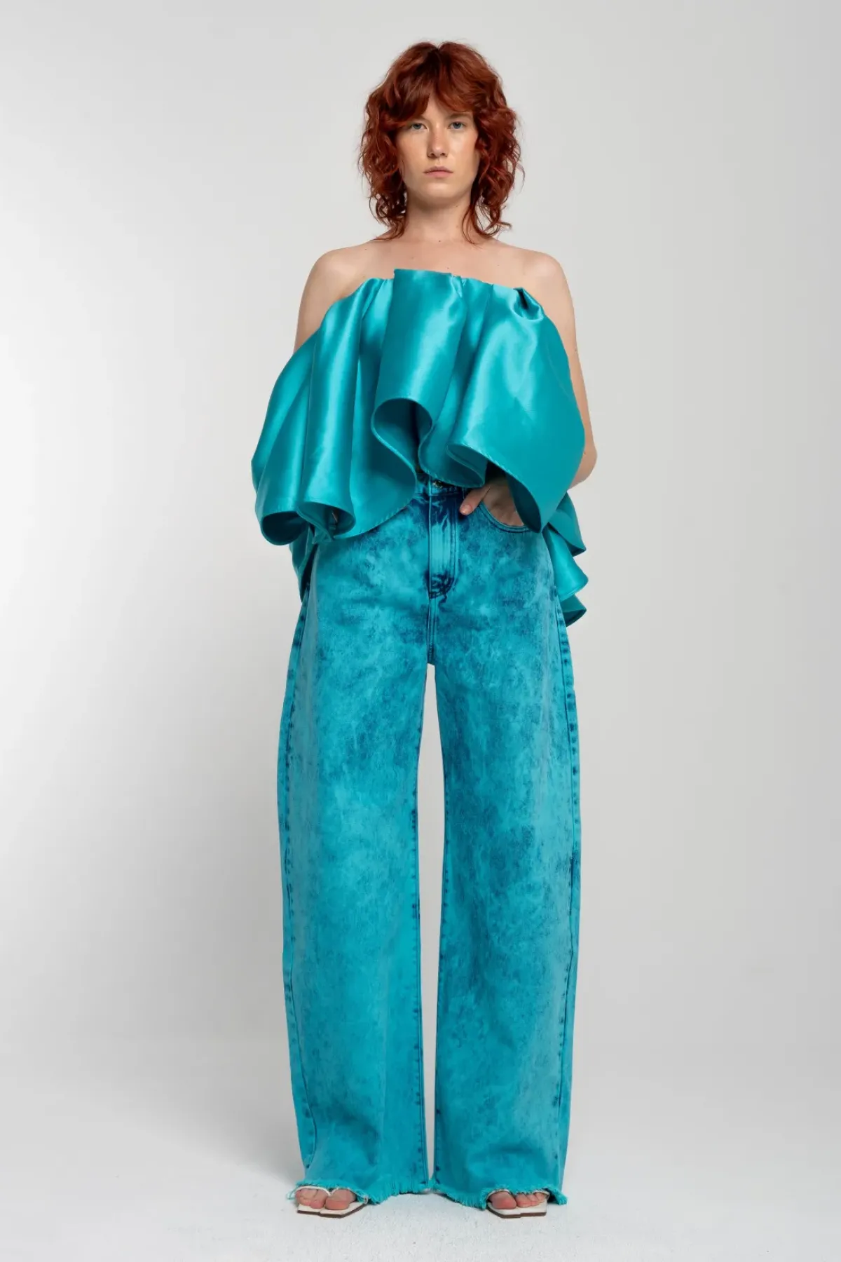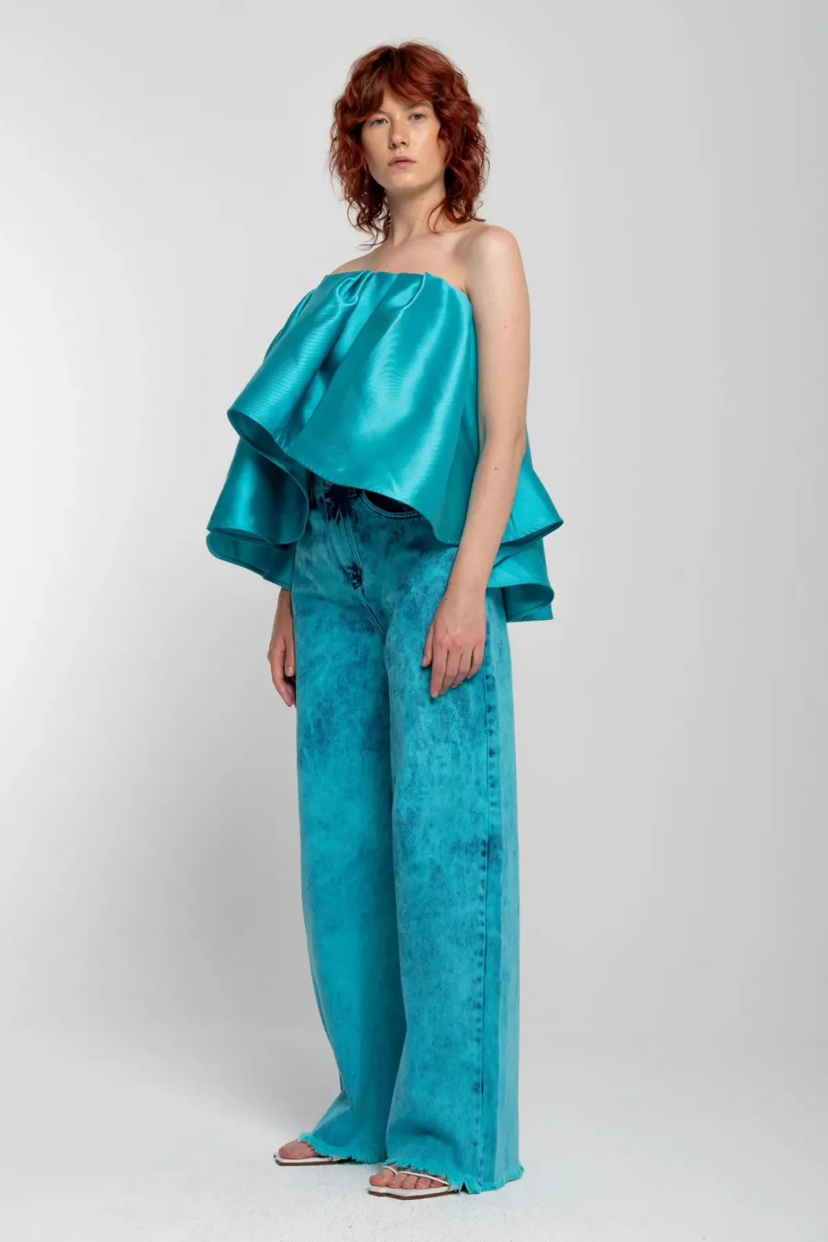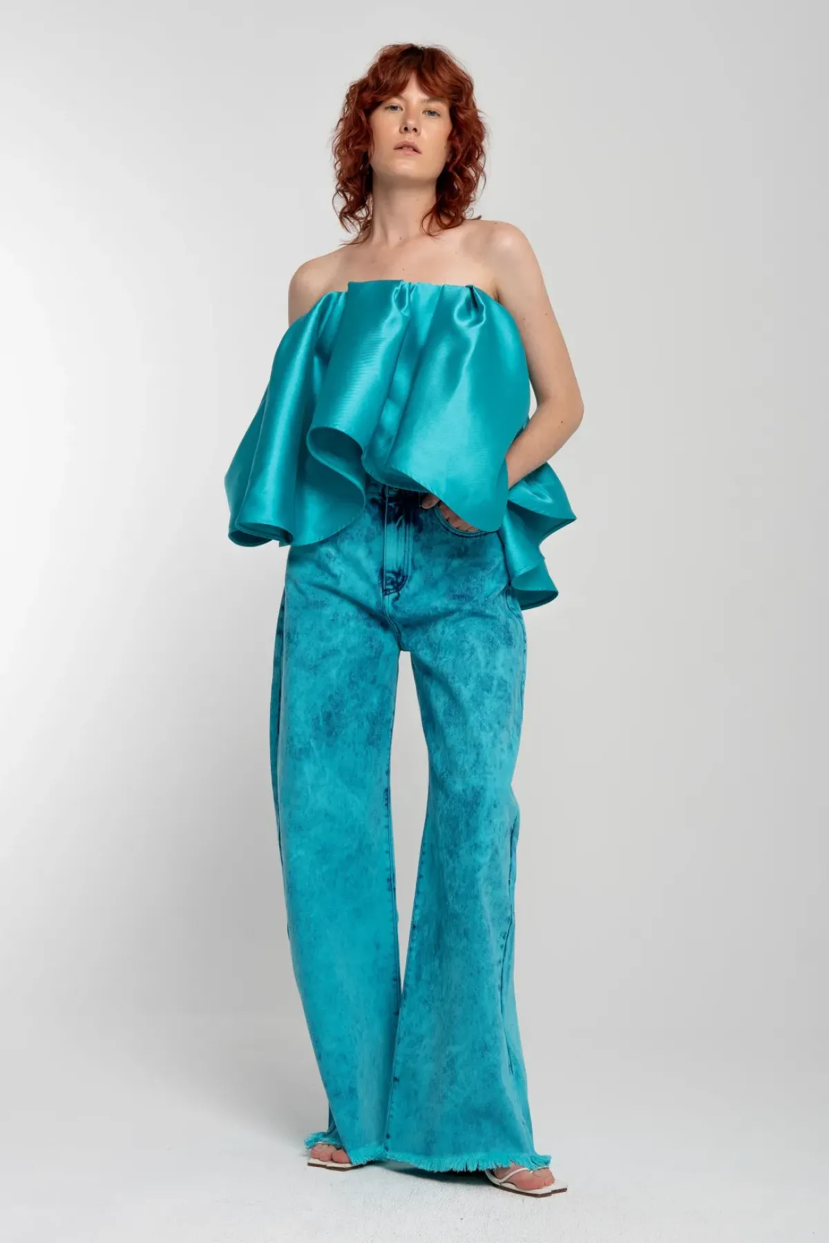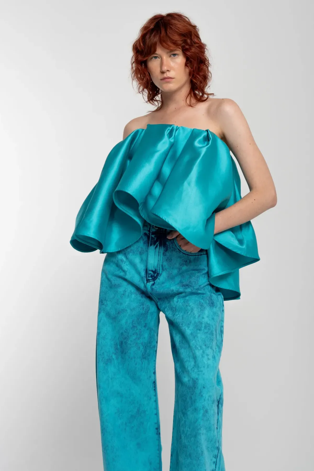 This turquoise mikado strapless top boasts a big flounce and is secured with a zipper closure – a top tier choice for any occasion!