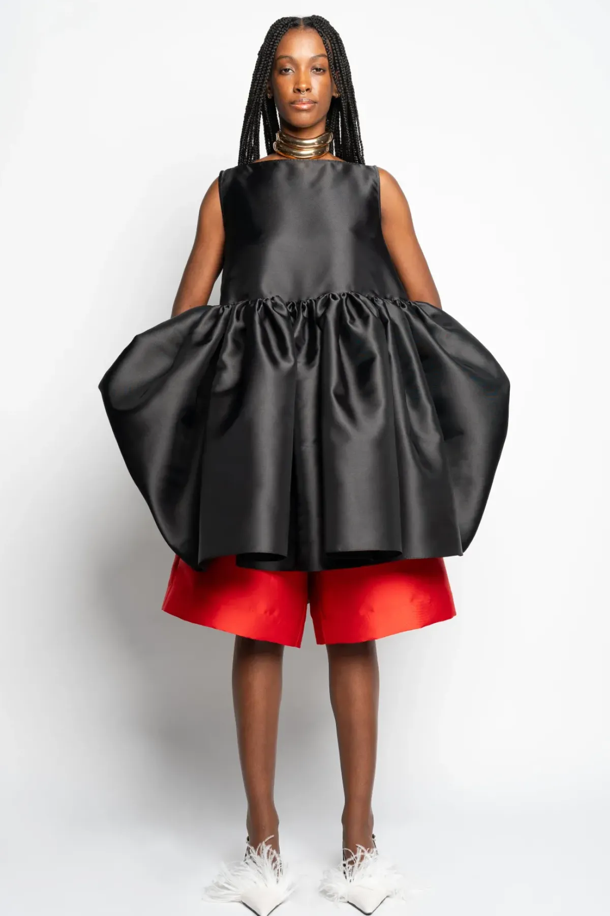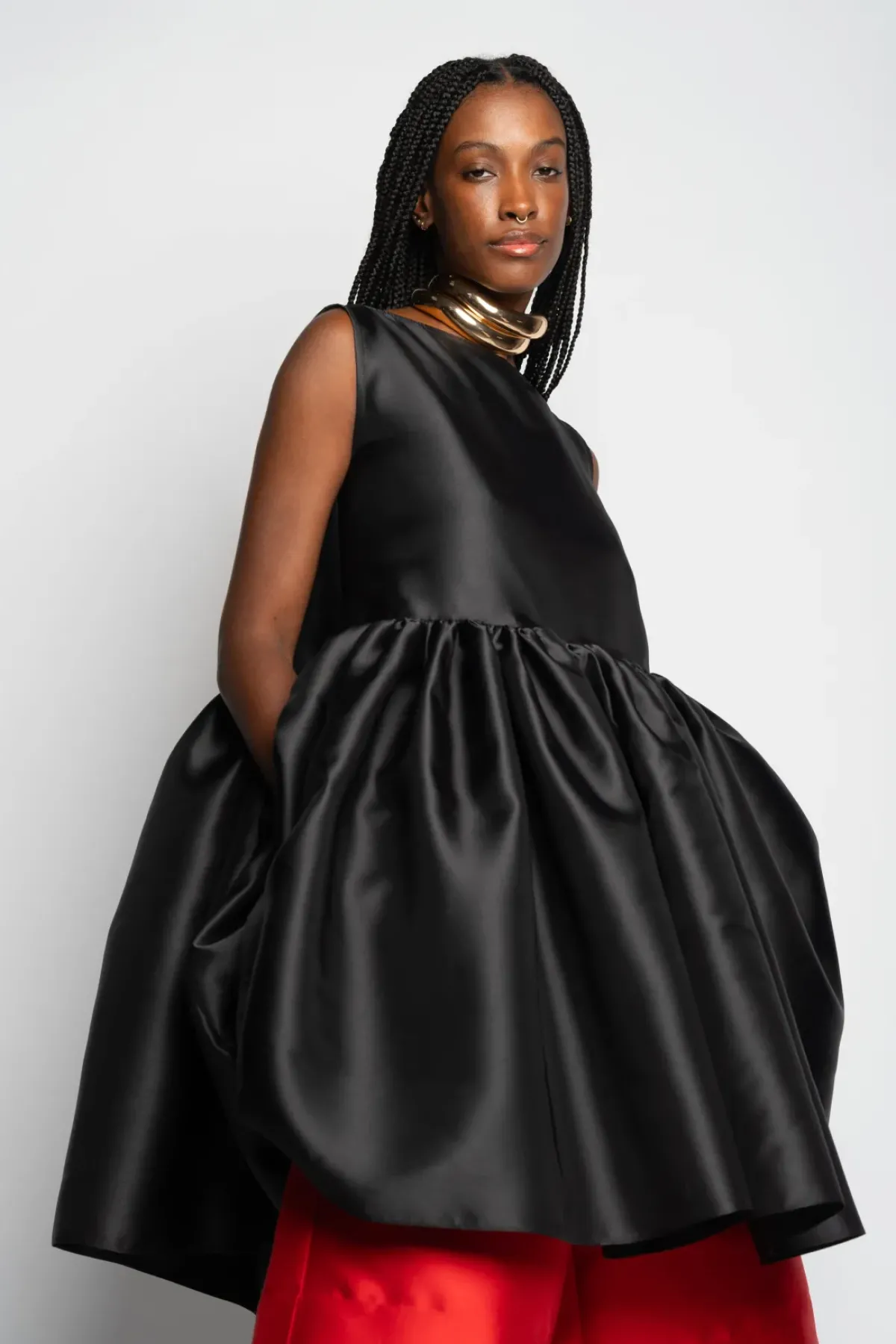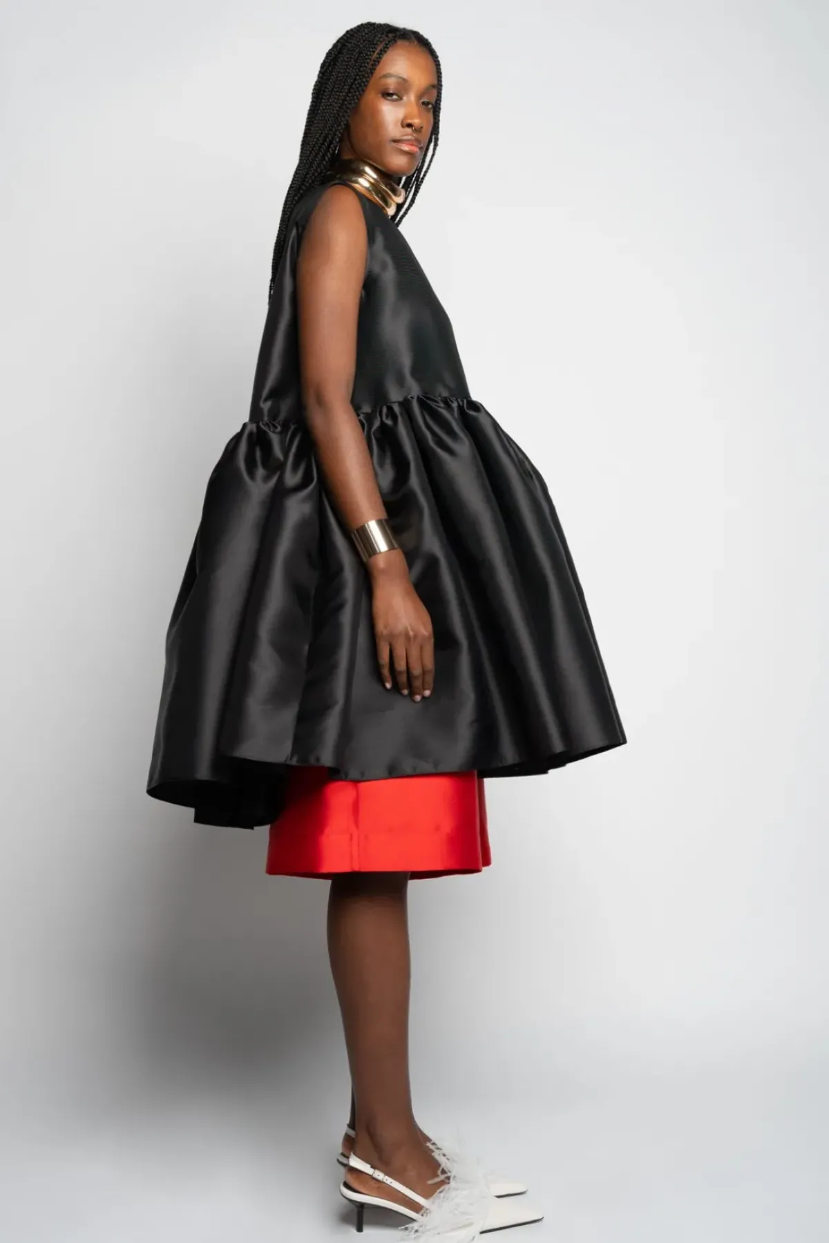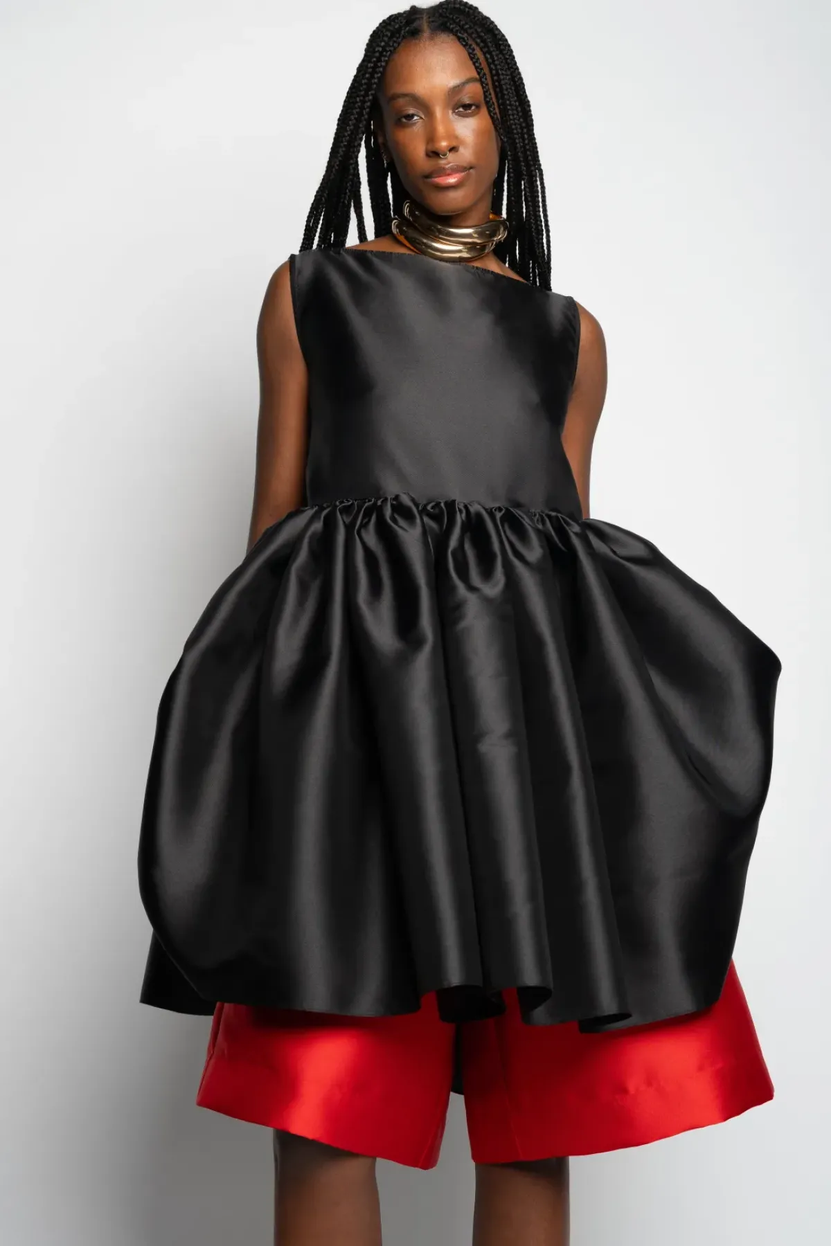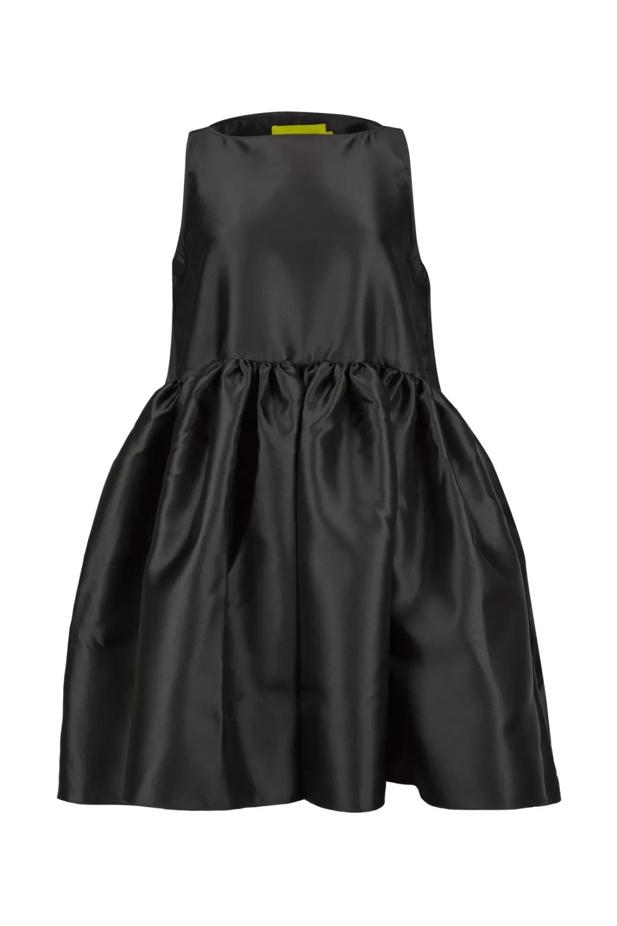 Step into the spotlight with this alluring black puff dress made from mikado fabric. Boasting a refined boat neckline and a playful puff hem, this dress exudes charm.