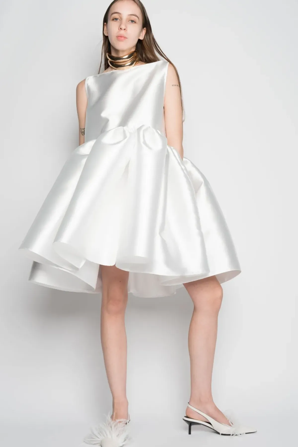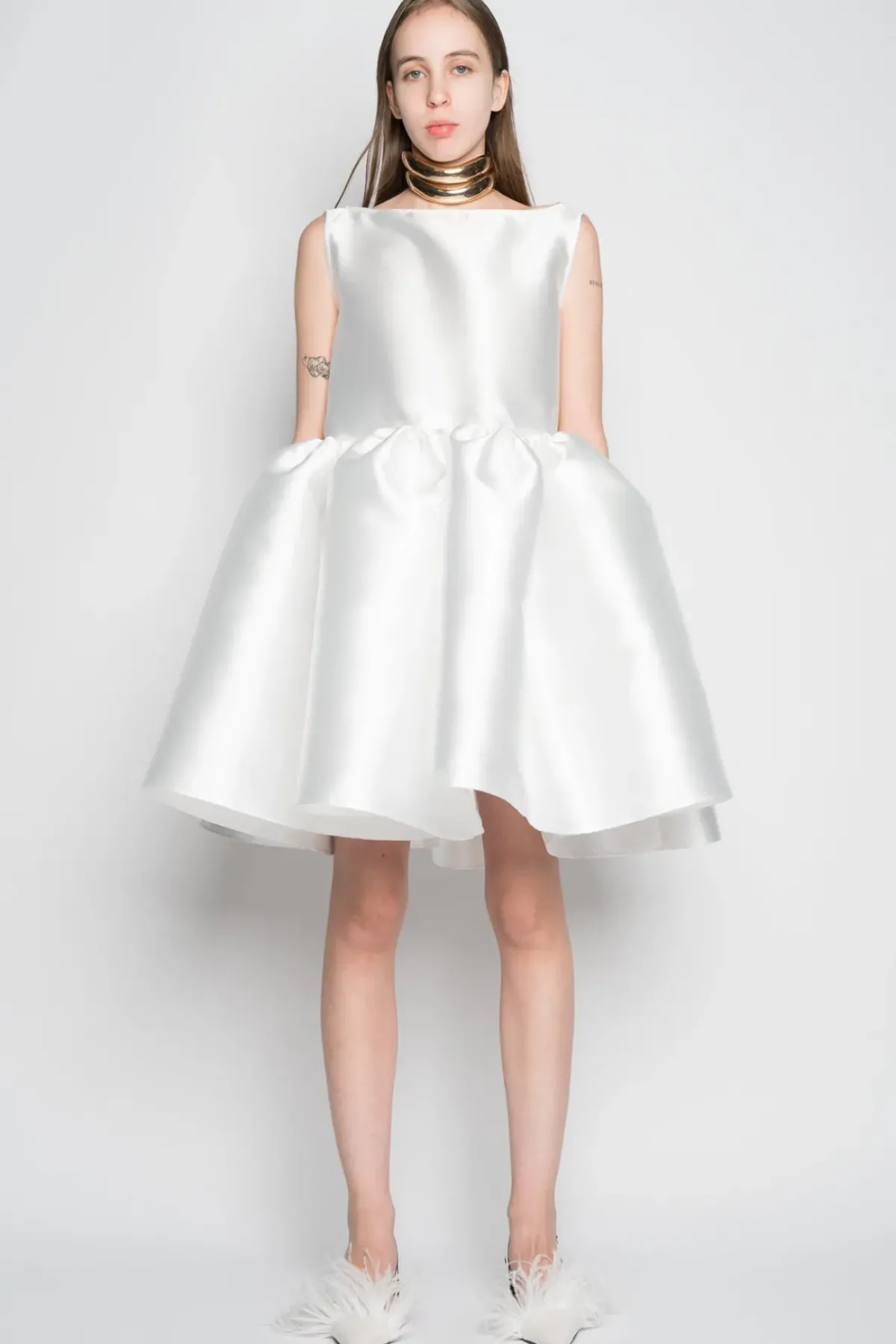 Be the centre of attention in this white puff dress, crafted from mikado fabric. The boat neckline exudes elegance and the playful puff hem adds a touch of charm. From special events to everyday wear, this dress will make you feel confident and stylish.