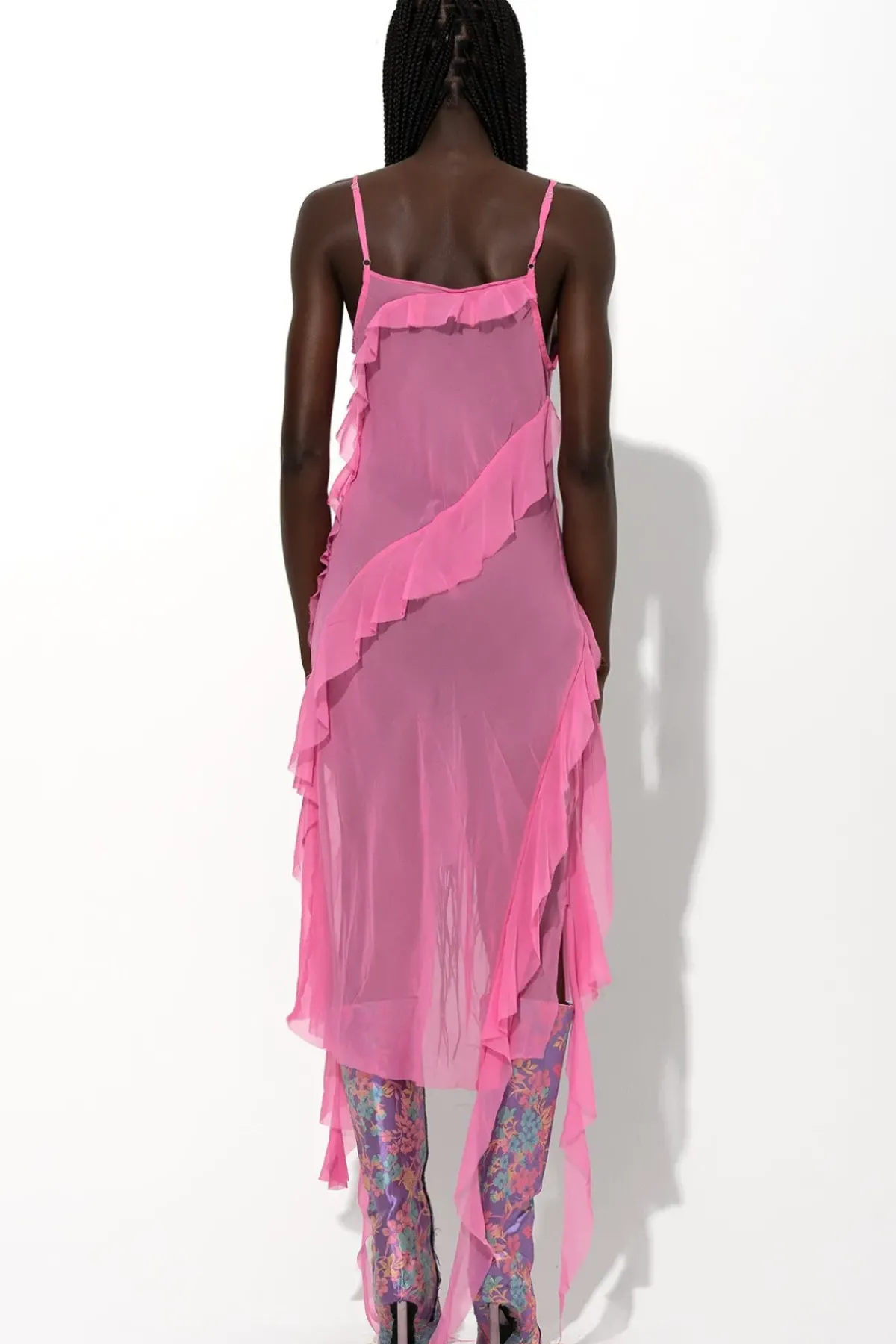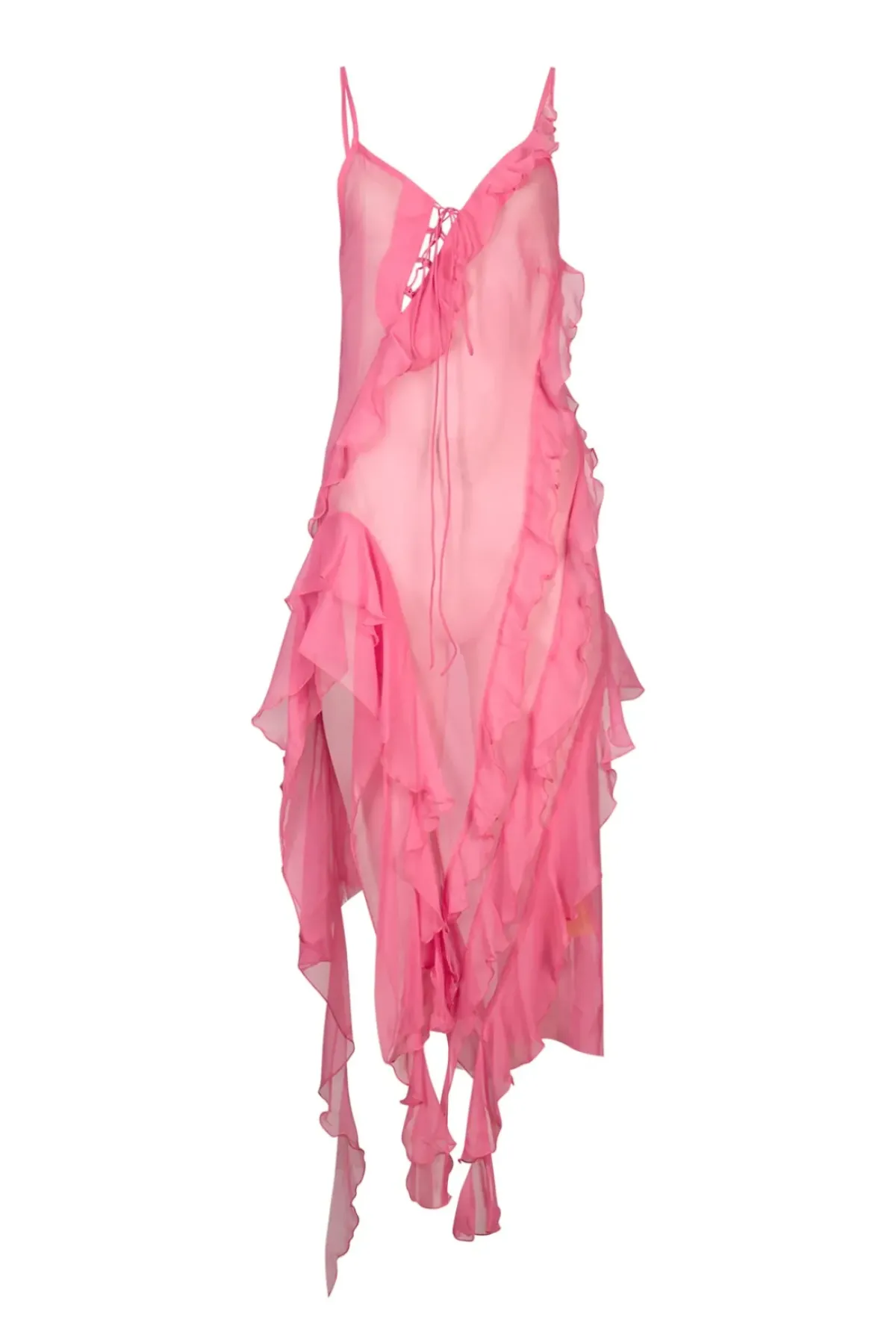 Strap dress in pink silk chiffon with cascade frills that fall asymmetrically. This dress has a leg slit and a chest opening that closes with a lace – a pink must-have!