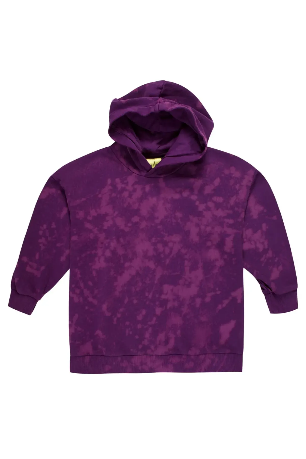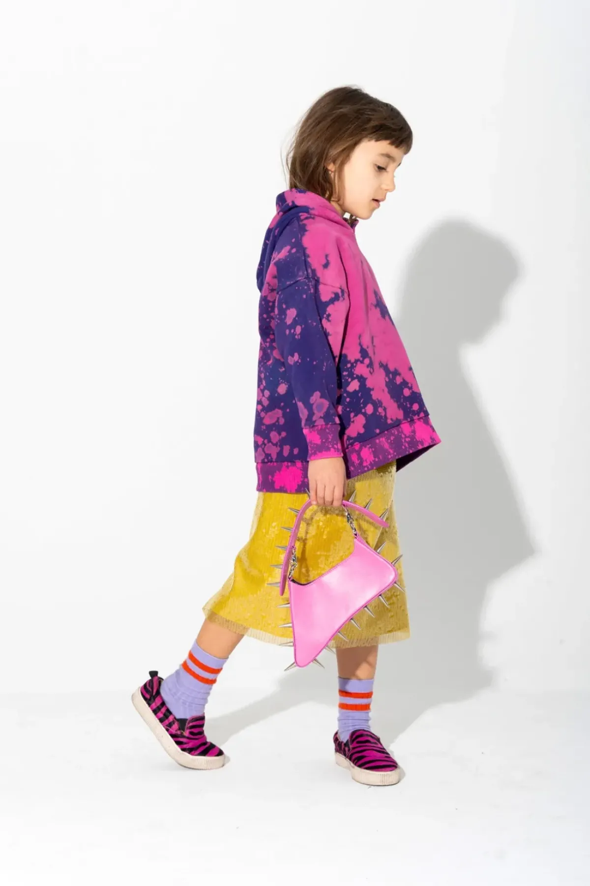 This fun and funky purple and pink fleece hoodie brings the splatter! It is kid-approved with long sleeves, ribbed cuffs and a hoodie neck.