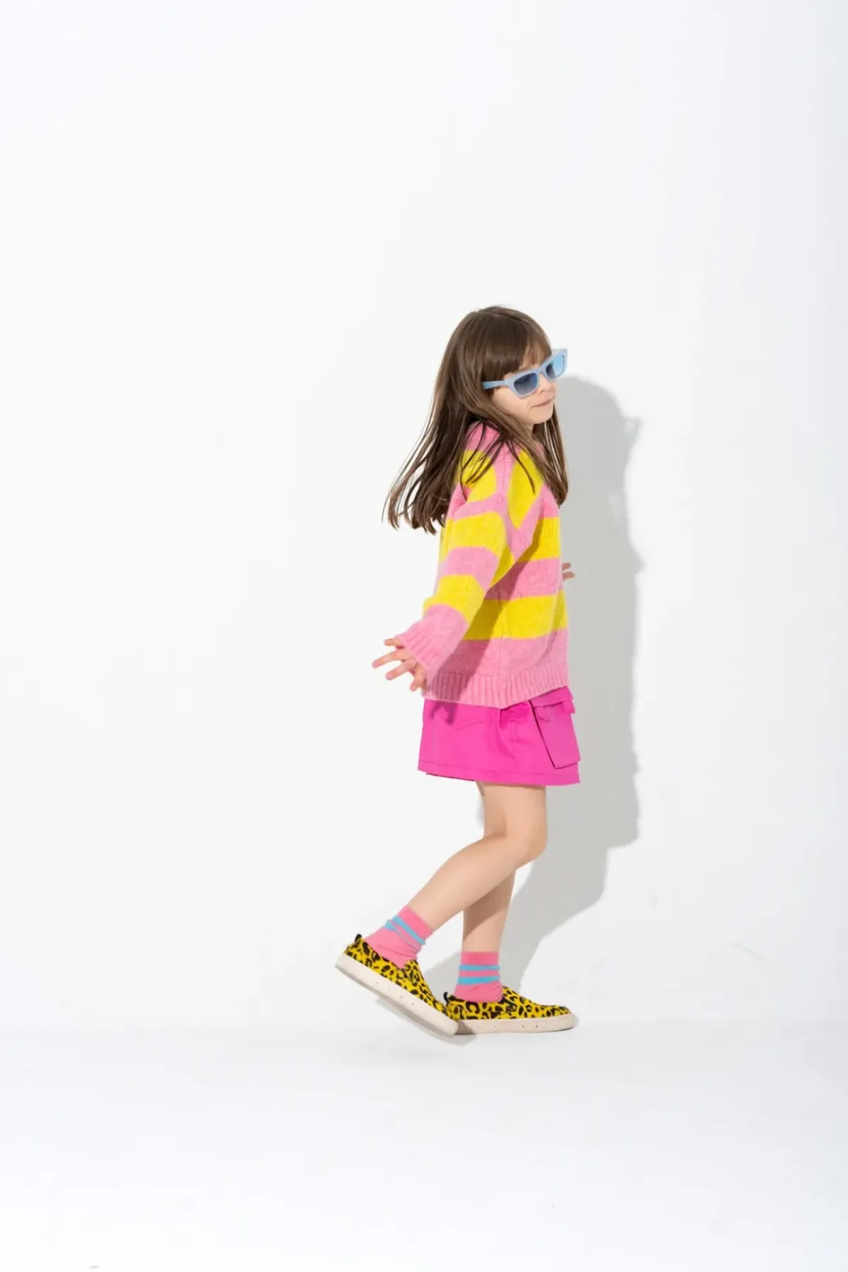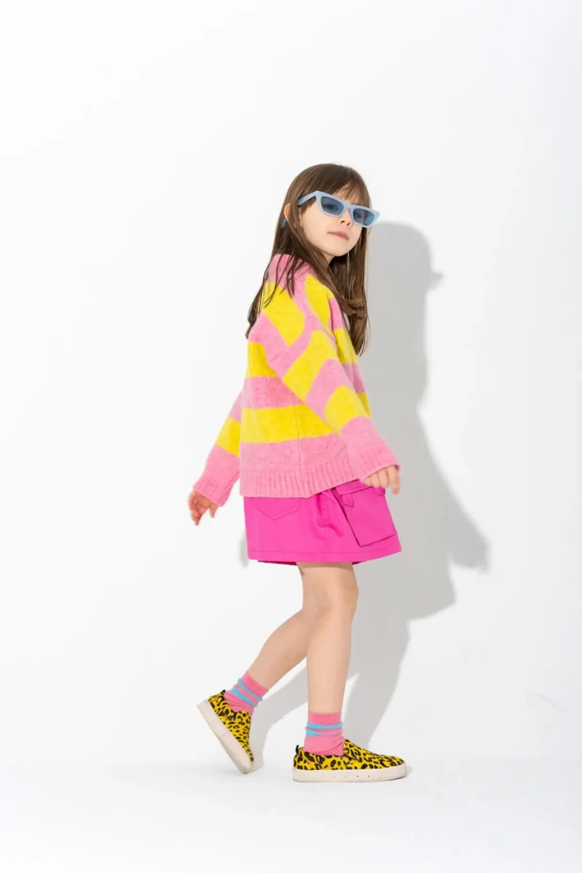 A snazzy striped sweater that'll give your kid a pop of colour – yellow and pink stripes on a crew neck, long-sleeved jumper for some fun and fashionable warmth.