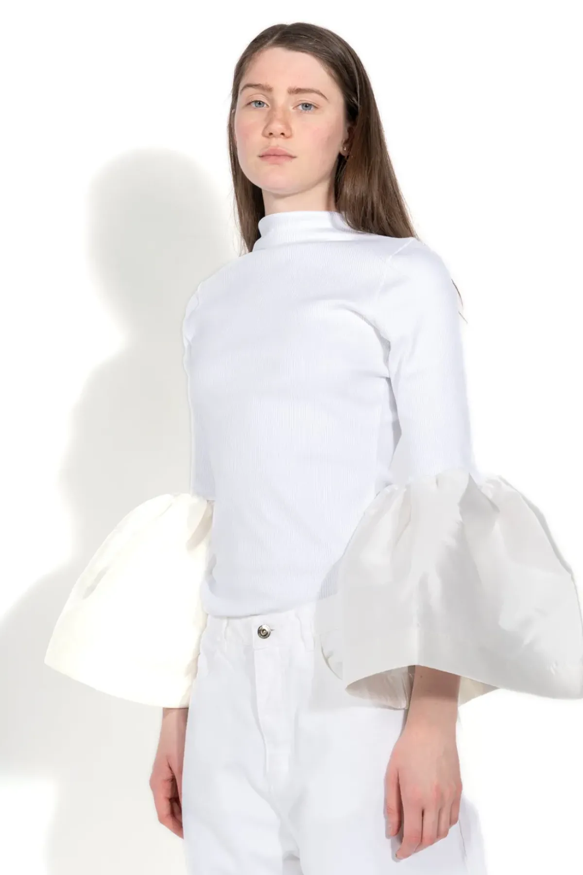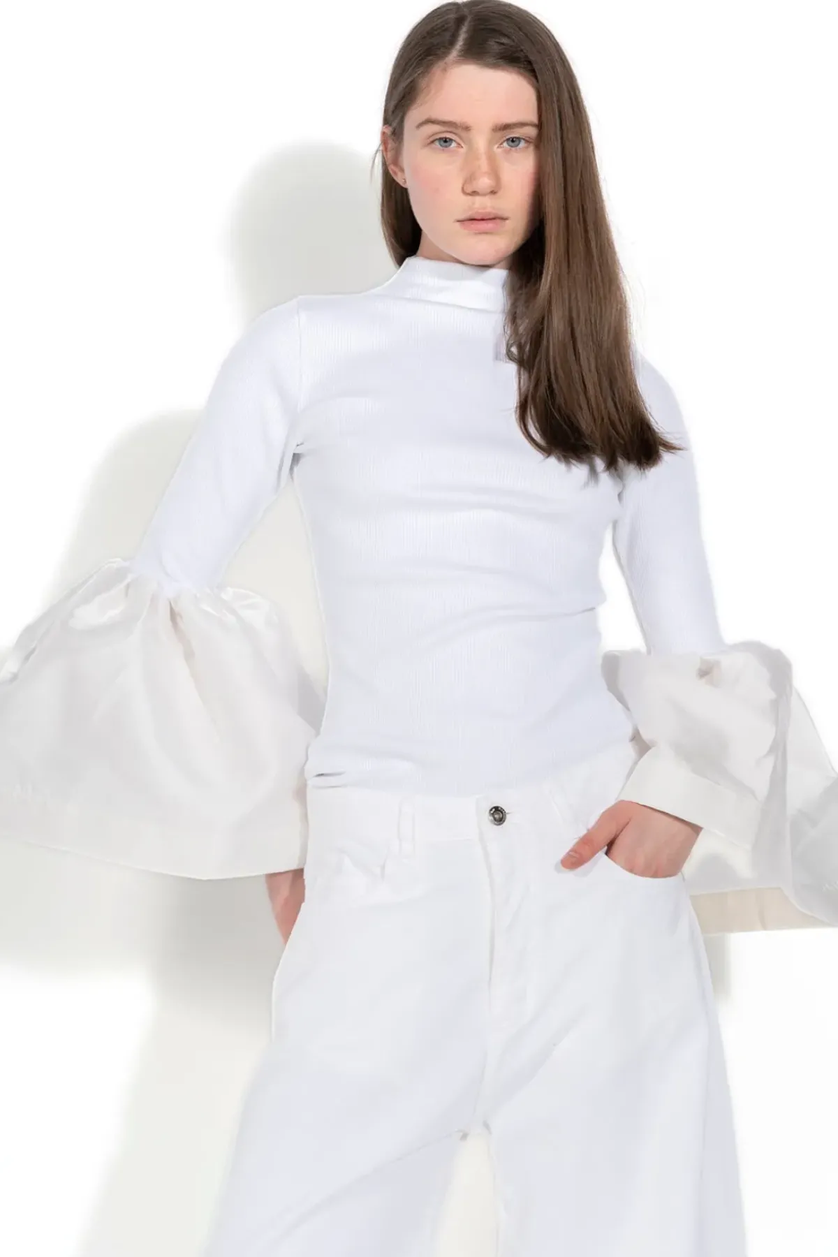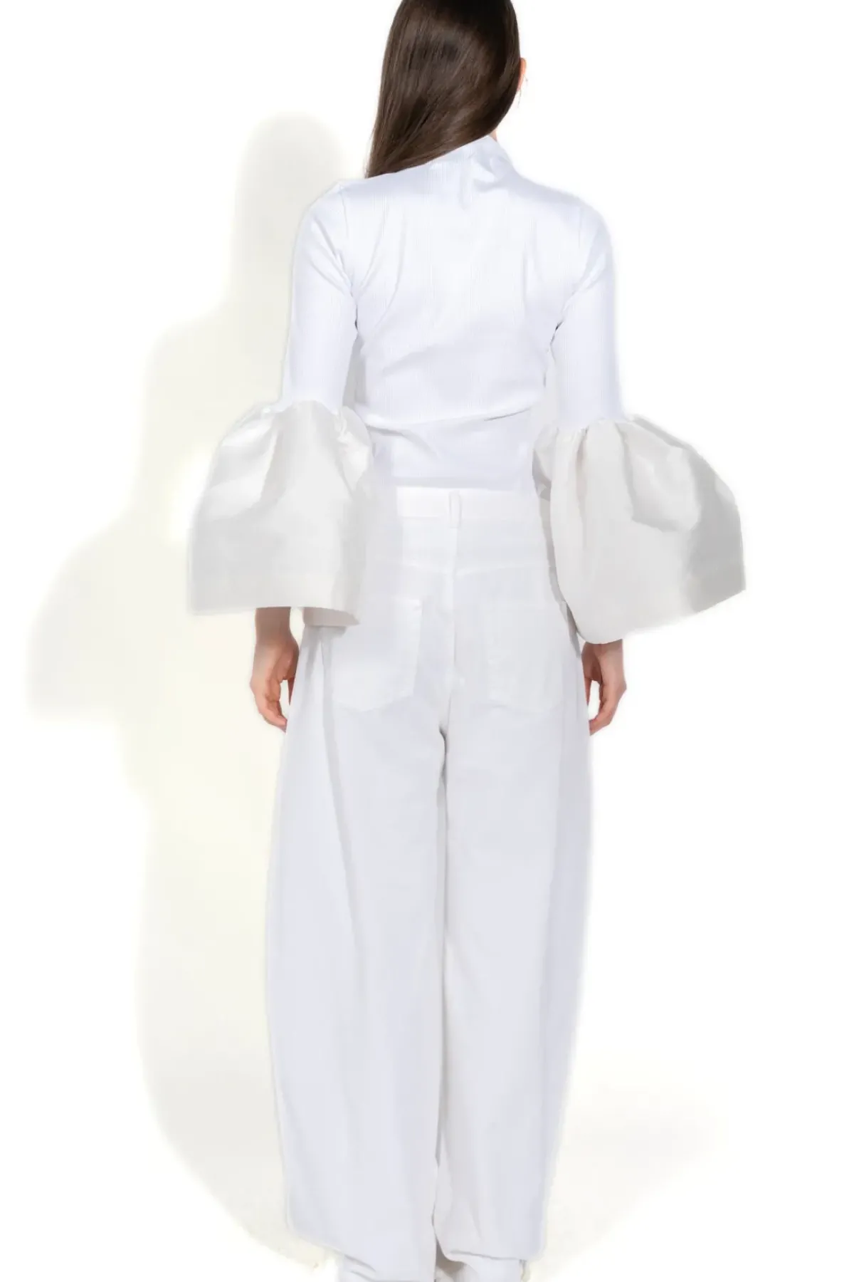 M'A turtleneck top boasting a rib jersey fabric and playful puff sleeves! Look and feel good with this white high-neck top.