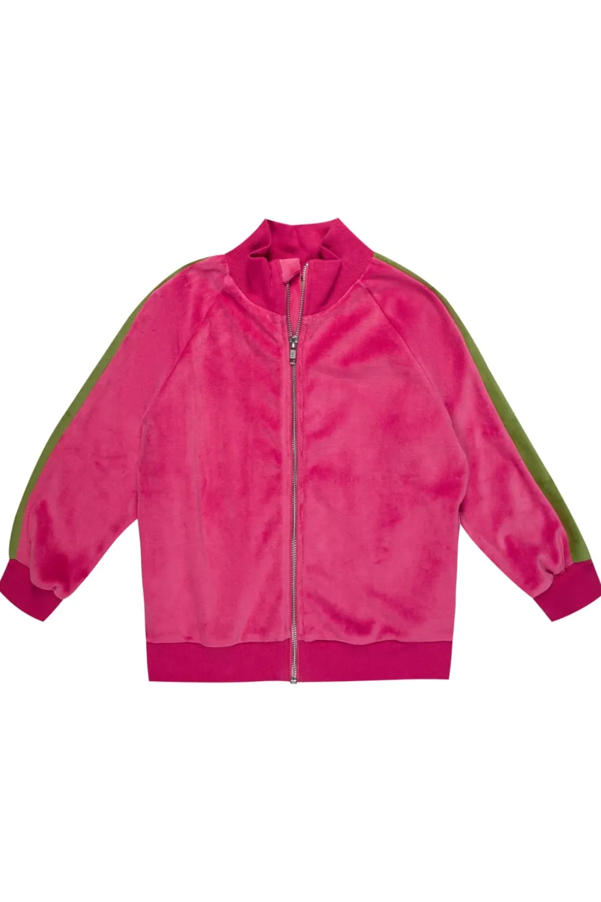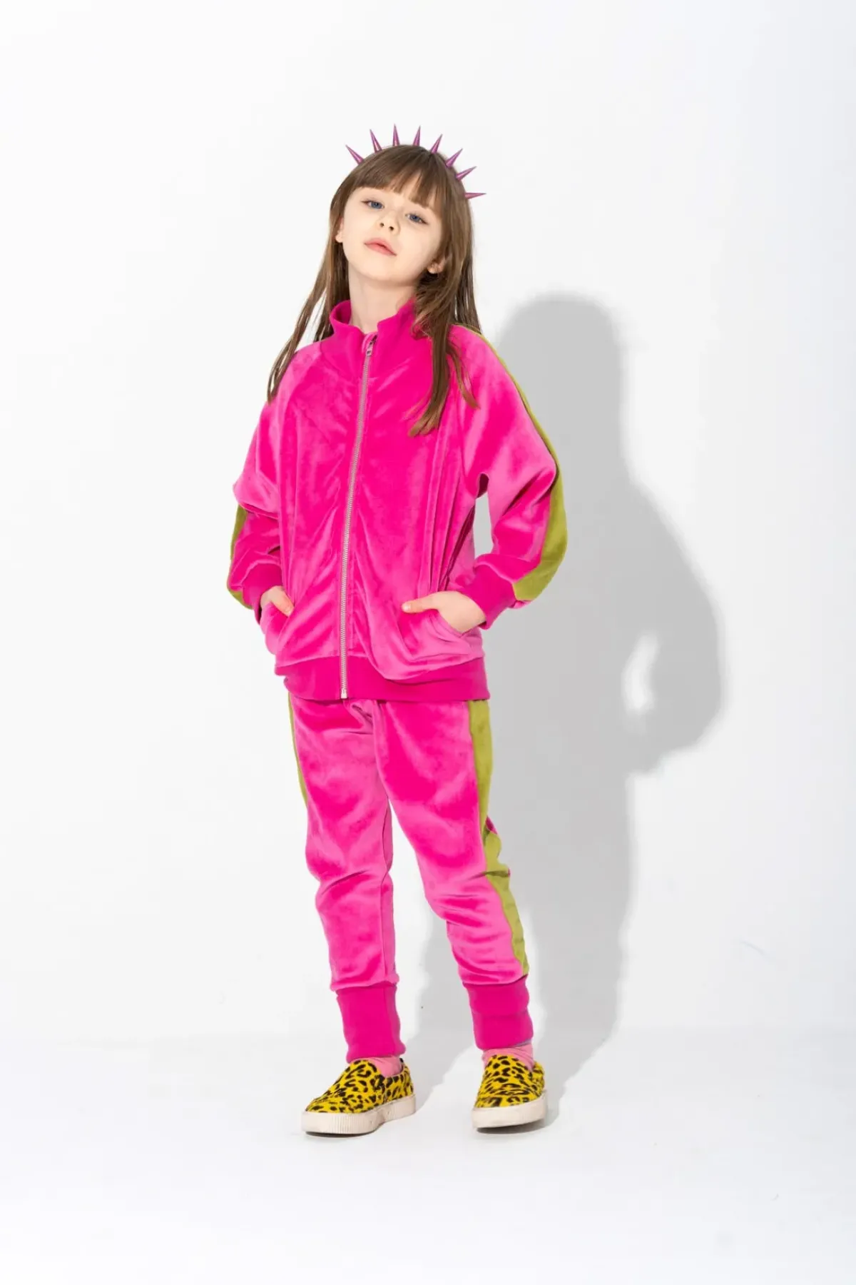 Zip your kid's look up with this bright pink velour jacket, complemented with arm stripes of green contrast tape!